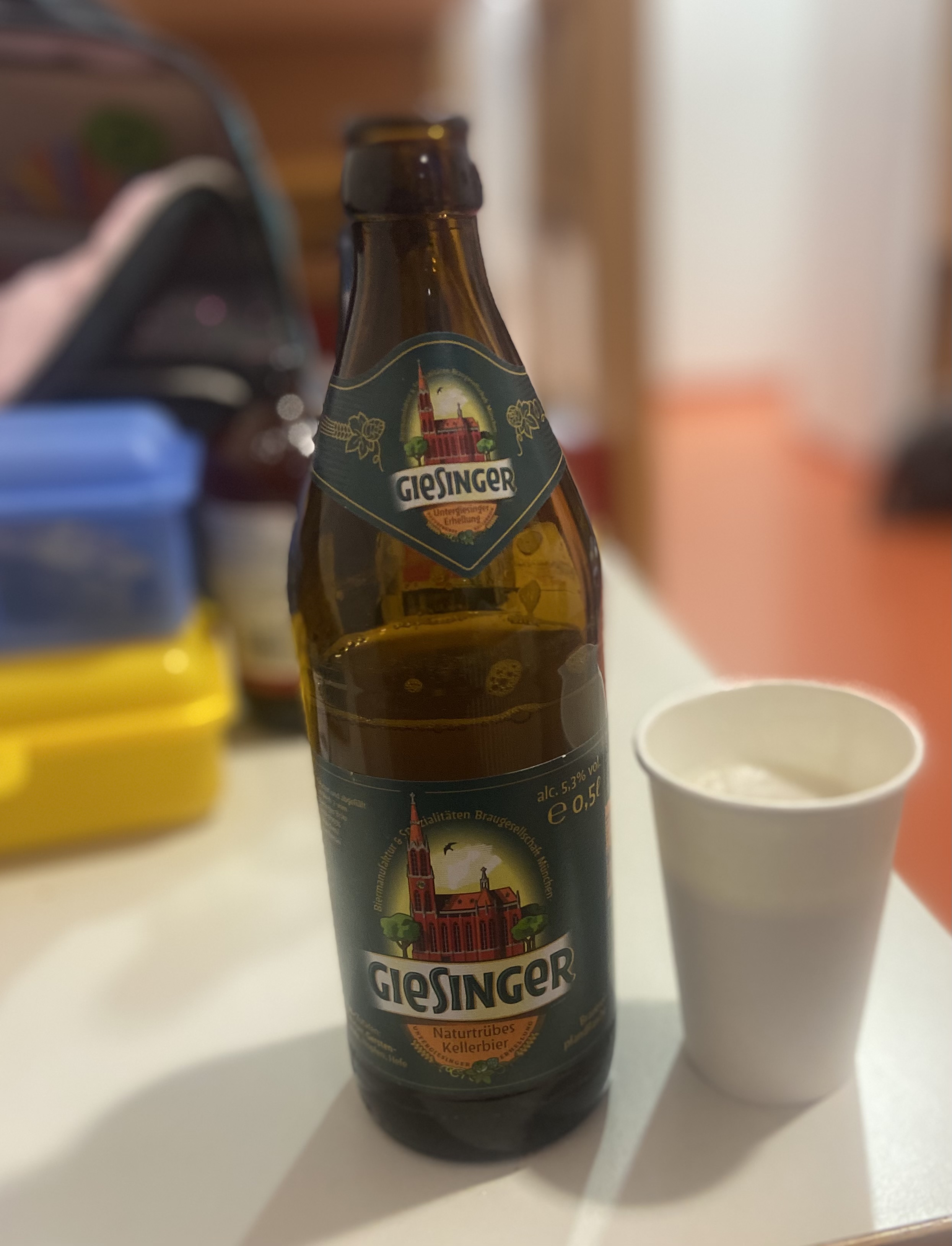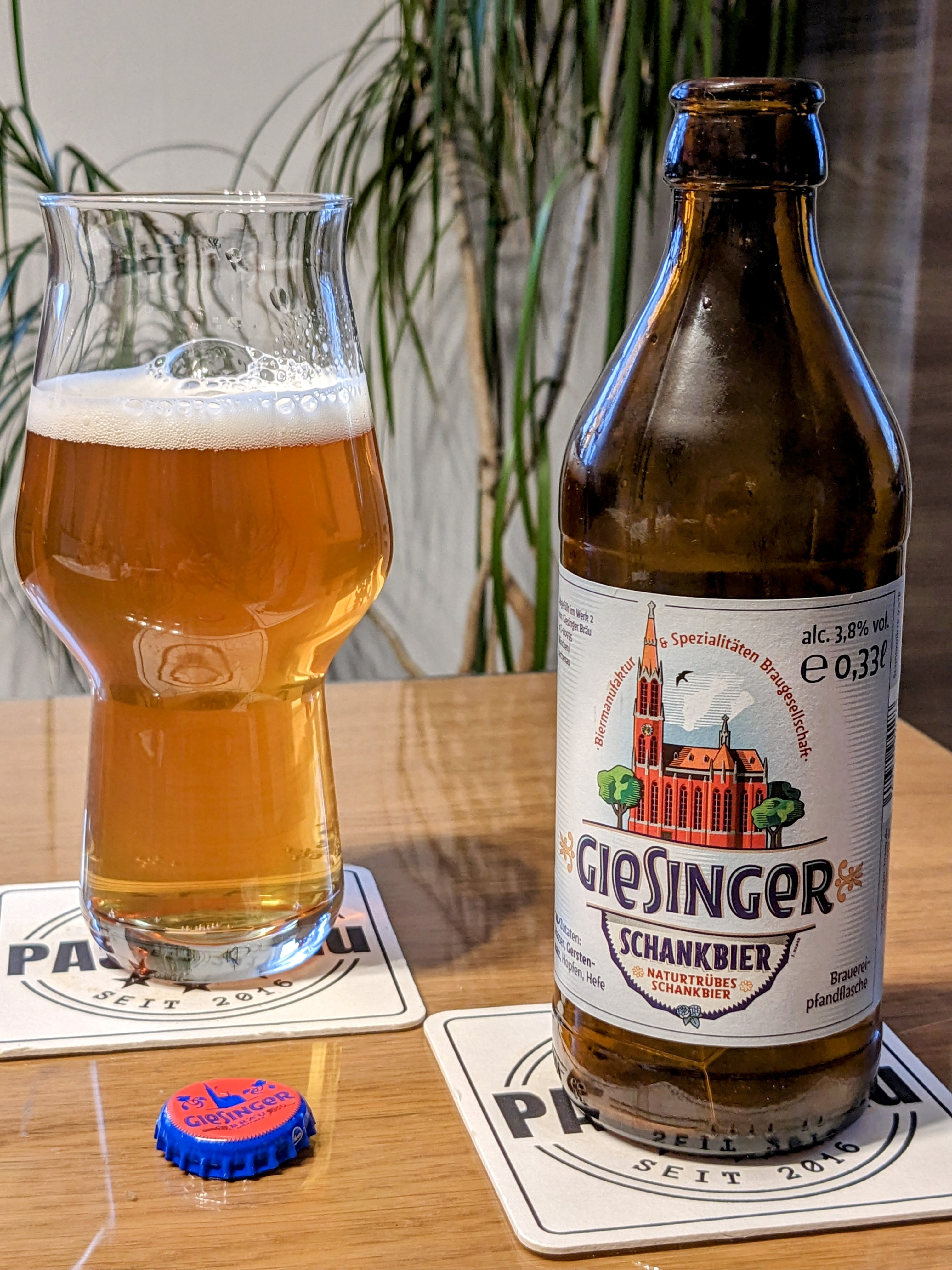 Giesinger Schankbier. Für ein leichtes Bier kommt es doch sehr voll daher. (Liegt vielleicht aber auch an der Abstinenz). Schönes Malzaroma und passende Bittere.