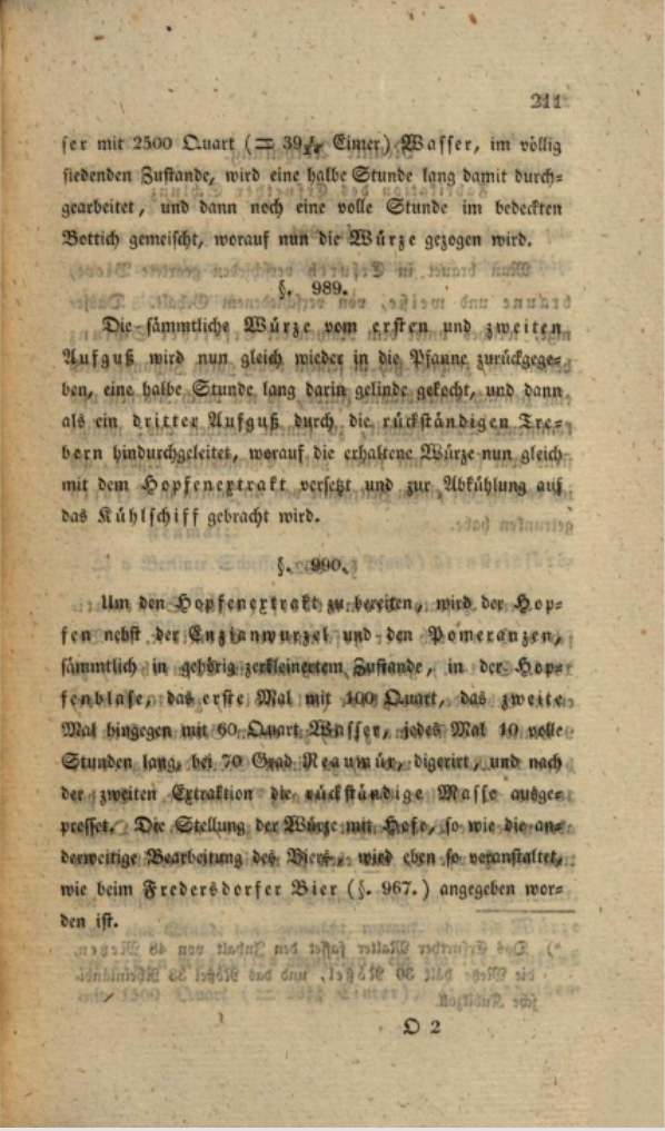 „Es war ehedem berühmt, dunkelbraun, klar und ziemlich nahrhaft, ist jezt aber nicht mehr so gut. Hermbstädt will es mit folgenden Stoffen nachgemacht haben: 20 Sch. braunes und 15 Sch. bernsteinfarbiges Gerstenmalz, 100 Pfund Hopfen, 5 Pfund rothe Enzianwurzel, 2 Pfund trokne grüne Pomeranzen."