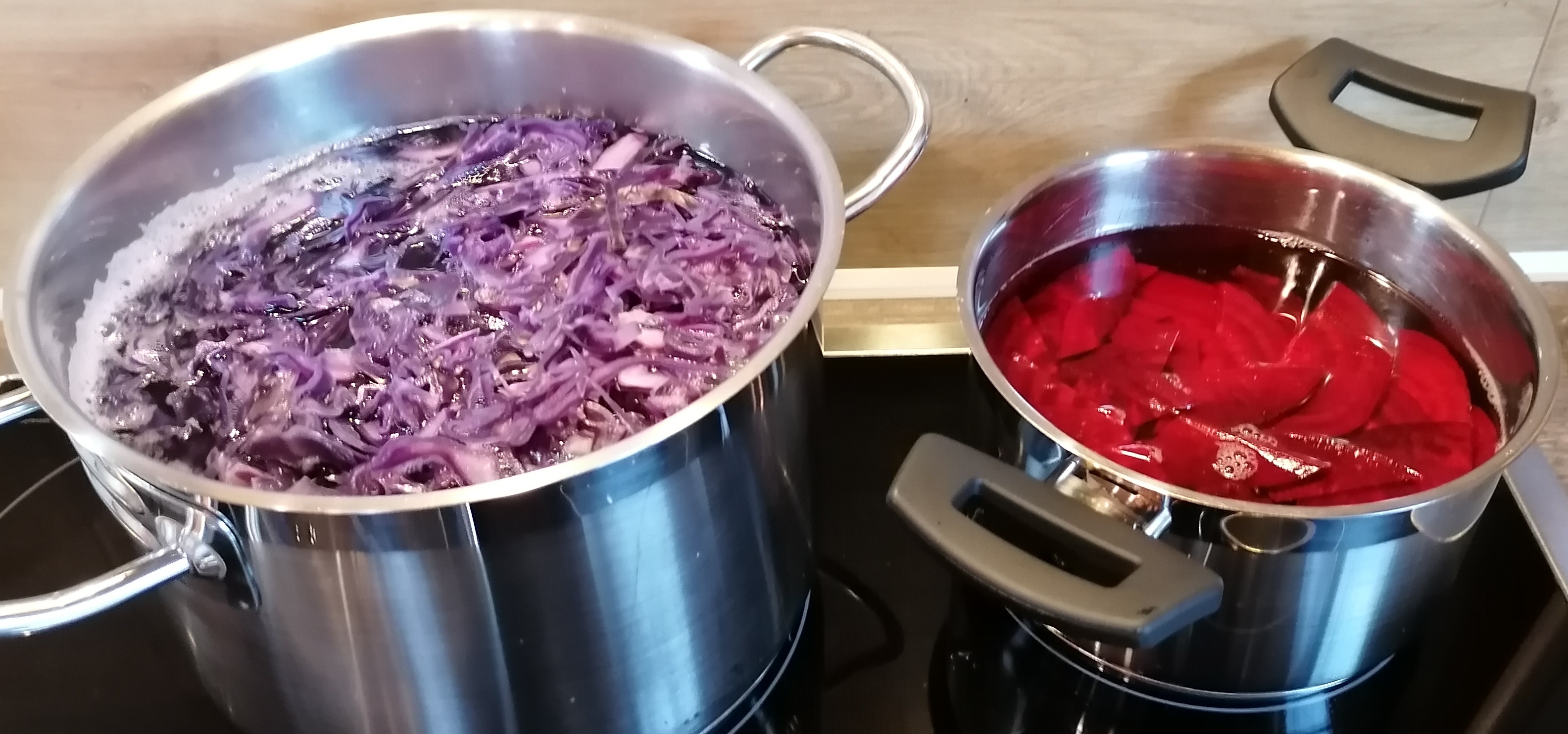 Hier das separate Kochen der Lila Karotten: Das separate Kochen der Süßkartoffel: Das separate Kochen des Rotkohls und der Roten Beete: Das Kochwasser aller Zutaten wurde zusammen gemischt, und ergab ca. 7 Liter mit 2,3 Brix.