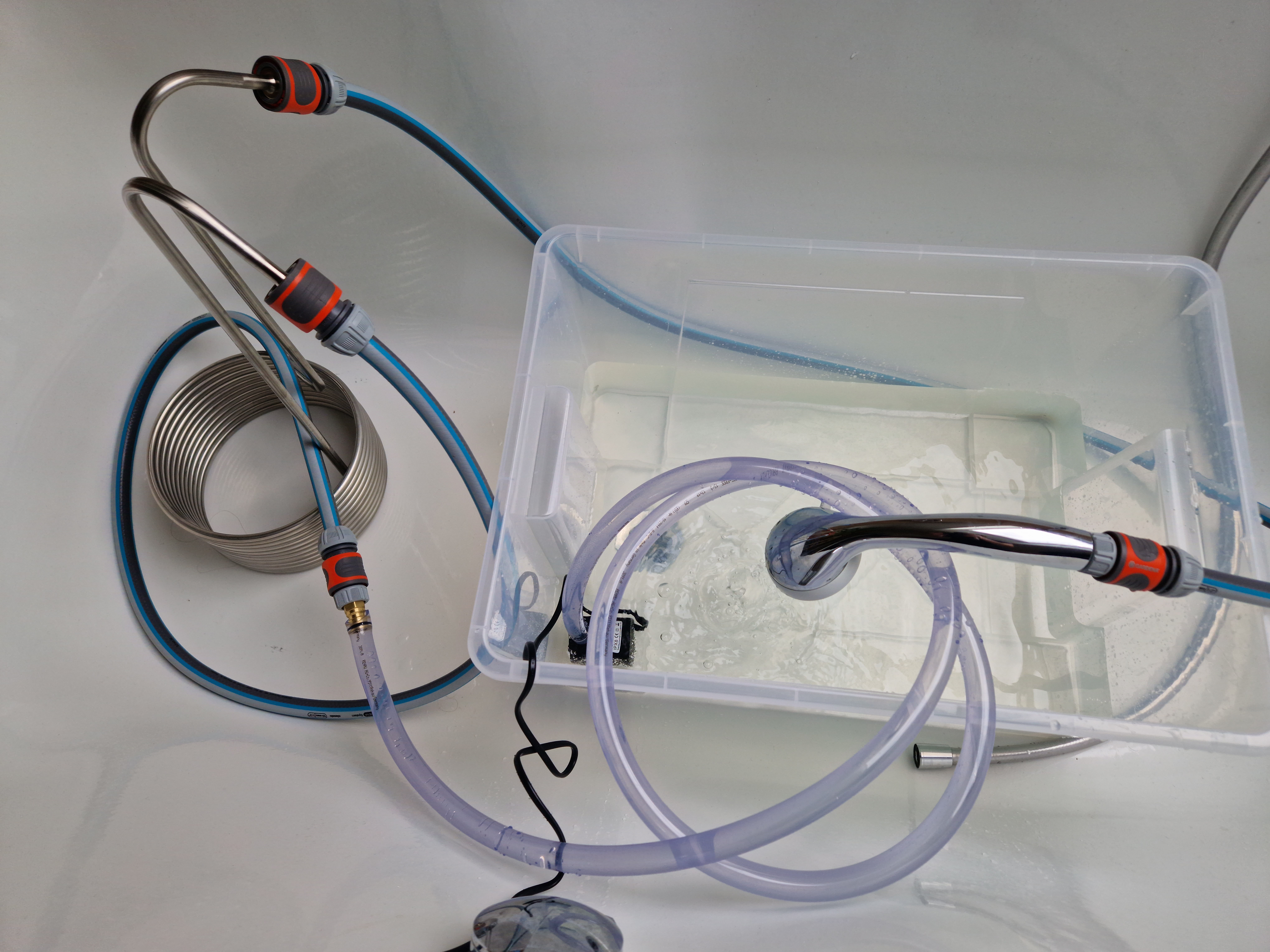 Zum Kühlen verwende ich eine Edelstahlspirale (Brewfarm) mit Gardena-Anschlüssen, laut Hersteller 20Liter in 20min auf 20°C: