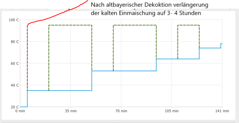 2. Eine modernere Variante ist in der Grafik dargestellt, wobei es keine Kalteinmaische Zeit gibt, sondern durch Zubrühen direkt auf die erste Rasttemperatur erhöht wird.