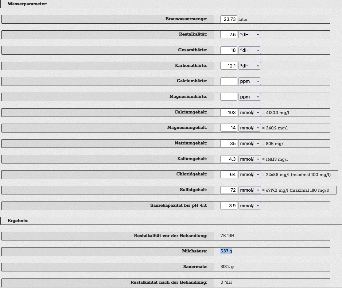 Der Rechner von Müggeland sagt mir nun für eine Brauwasser-Gesamtmenge von knapp 24l einen Zusatz von 5,87g Milchsäure. Fein.
