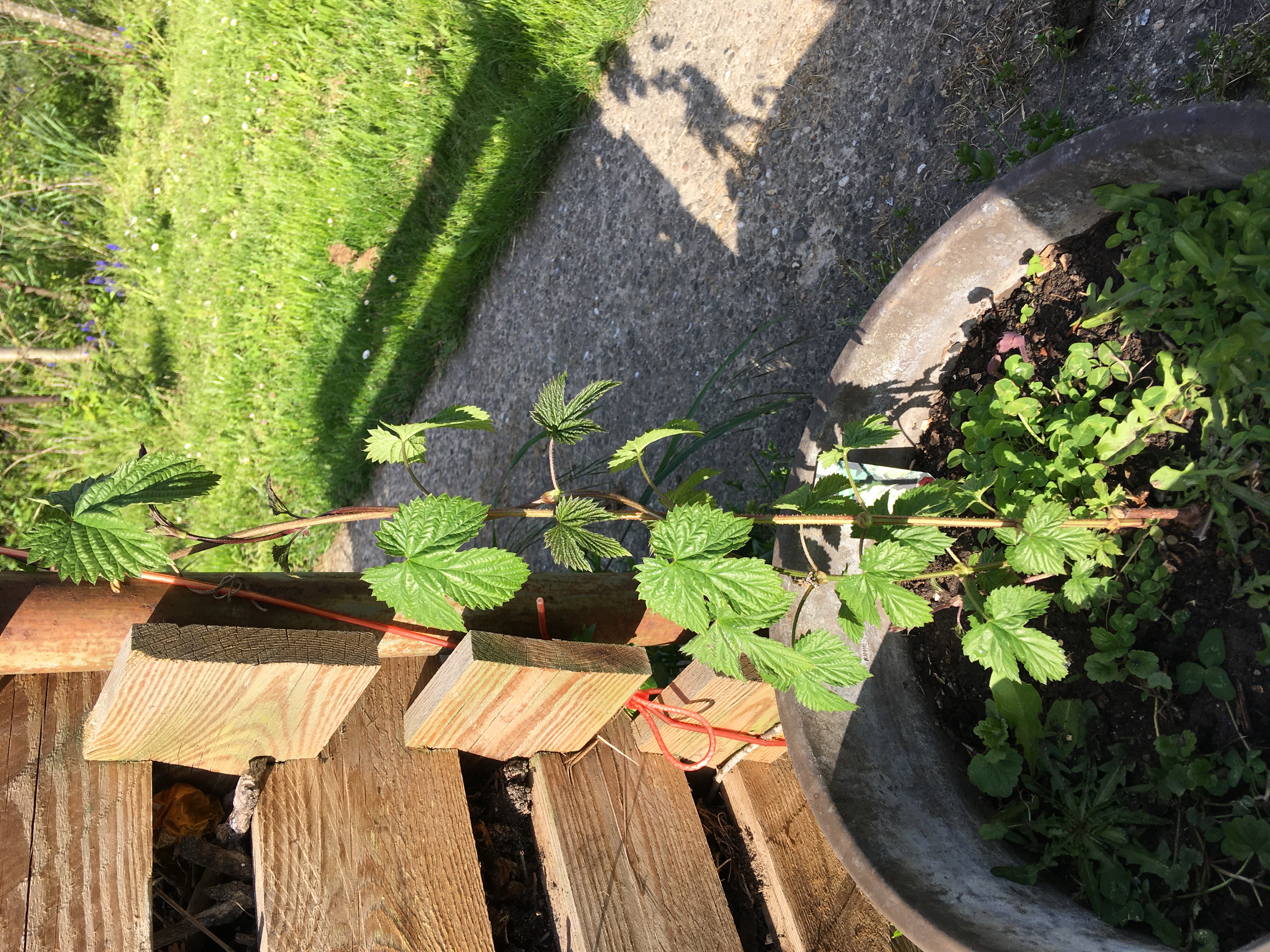 Im jetzt dritten Jahr nach dem Kauf und dem zweiten nach dem Auspflanzen kommen beide Hopfenpflanzen sehr gut, letztes Jahr blieben sie mit knapp über 2 Metern Höhe doch unter meinen Erwartungen. Dieses Jahr ist besonders der Saphir (vorne) sehr weit, der Comet (hinten) braucht etwas länger.