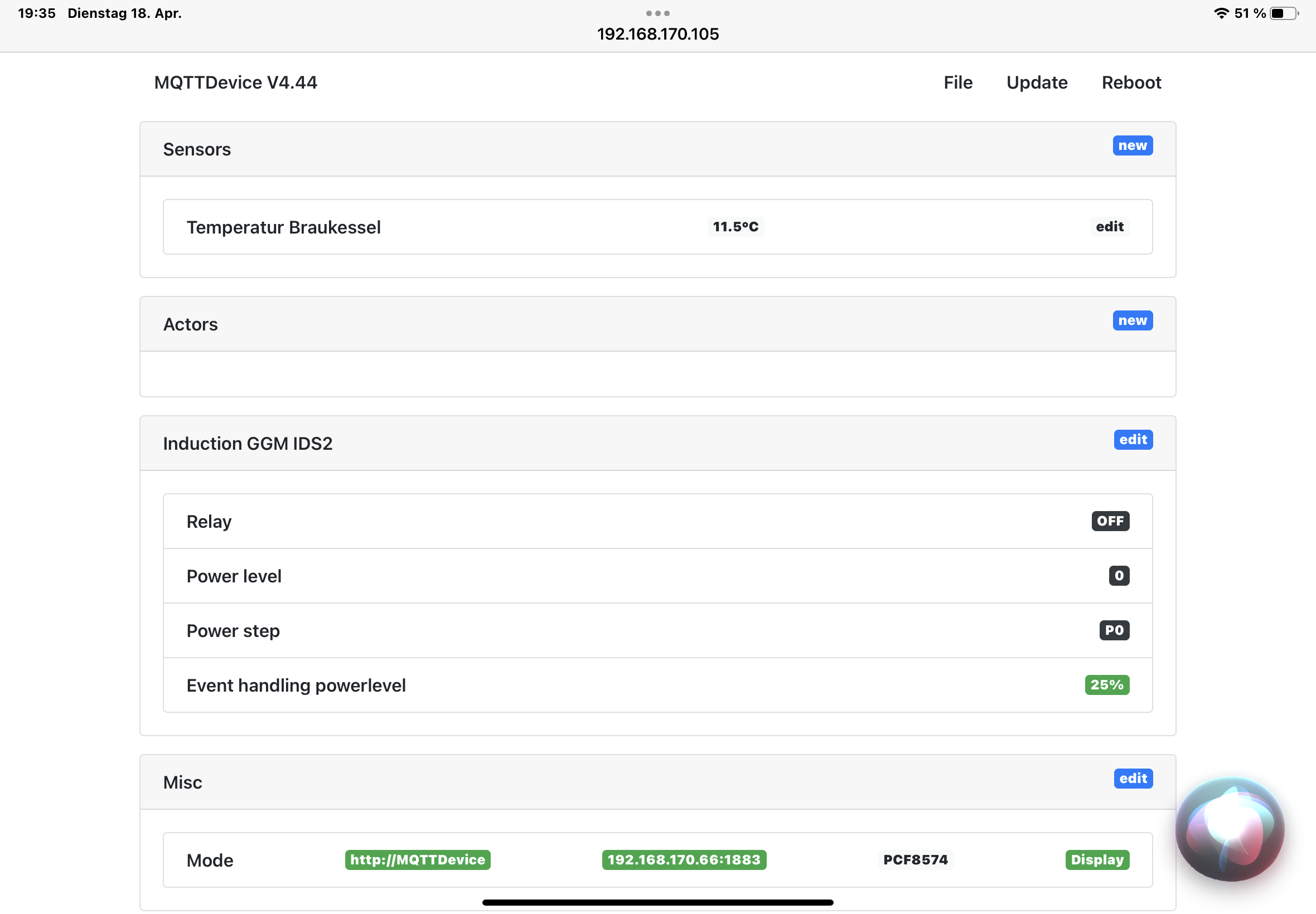 Also bin echt am verzweifeln. Die IDS2 will einfach nicht anspringen, obwohl sie das schon mal tat mit der Version 4.43. Nach dem Update, ich bin mir nicht sicher, eher nicht. Wenn ich Autotune versuche passiert nichts, bei der Einstellung Boil kann es sein das das Relais angeht, aber sonst keine Leistung abruft. Was ich gemacht hatte, ein 2. Dashboard hab ich nur mit dem braukessel eingerichtet um Autotune dort zu machen, aber da ging es dann schon nimmer. Ich hab die Version in Verbindung mit dem Raspi und Display.
