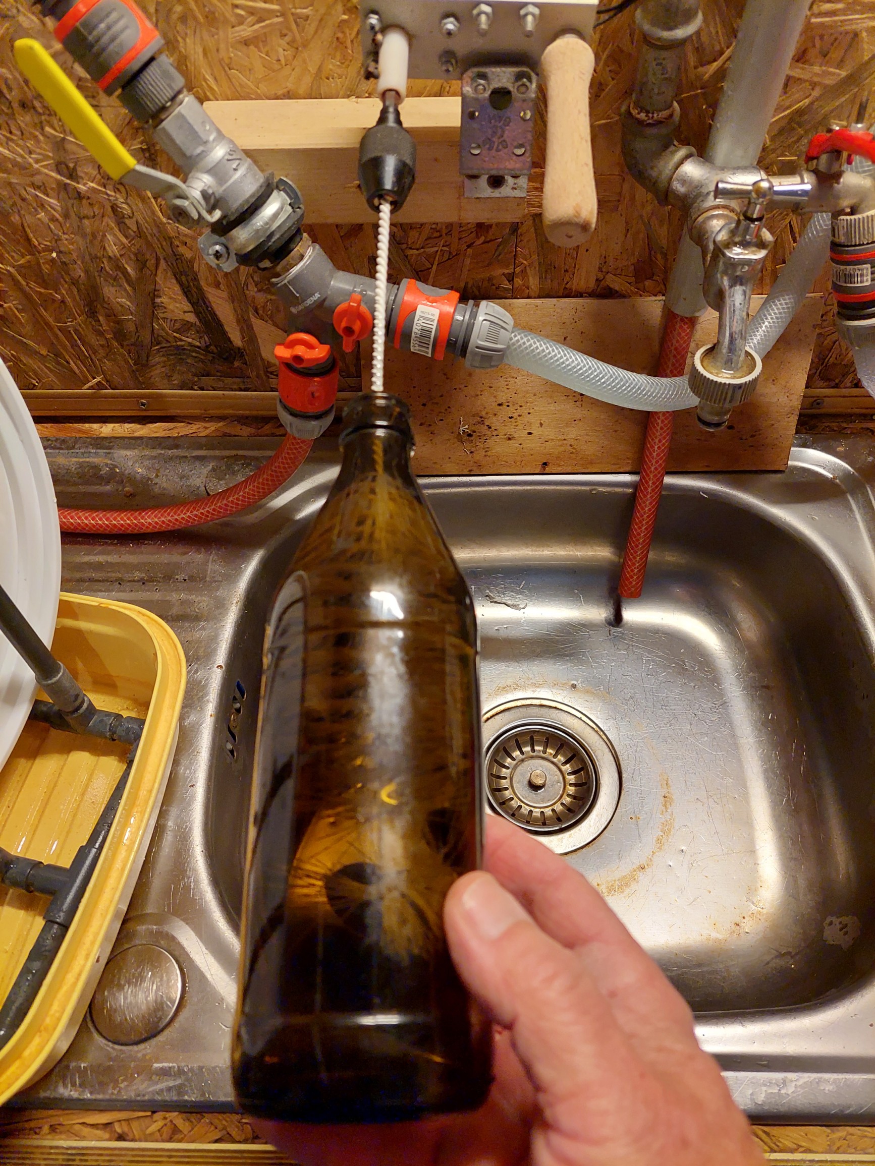 Anfangs machte ich das von Hand, dann habe ich die Spülbürste an einen langsam drehenden Getriebemotor montiert und bürste sobald sich ca. 10 Flaschen angesammelt haben diese nacheinander durch.