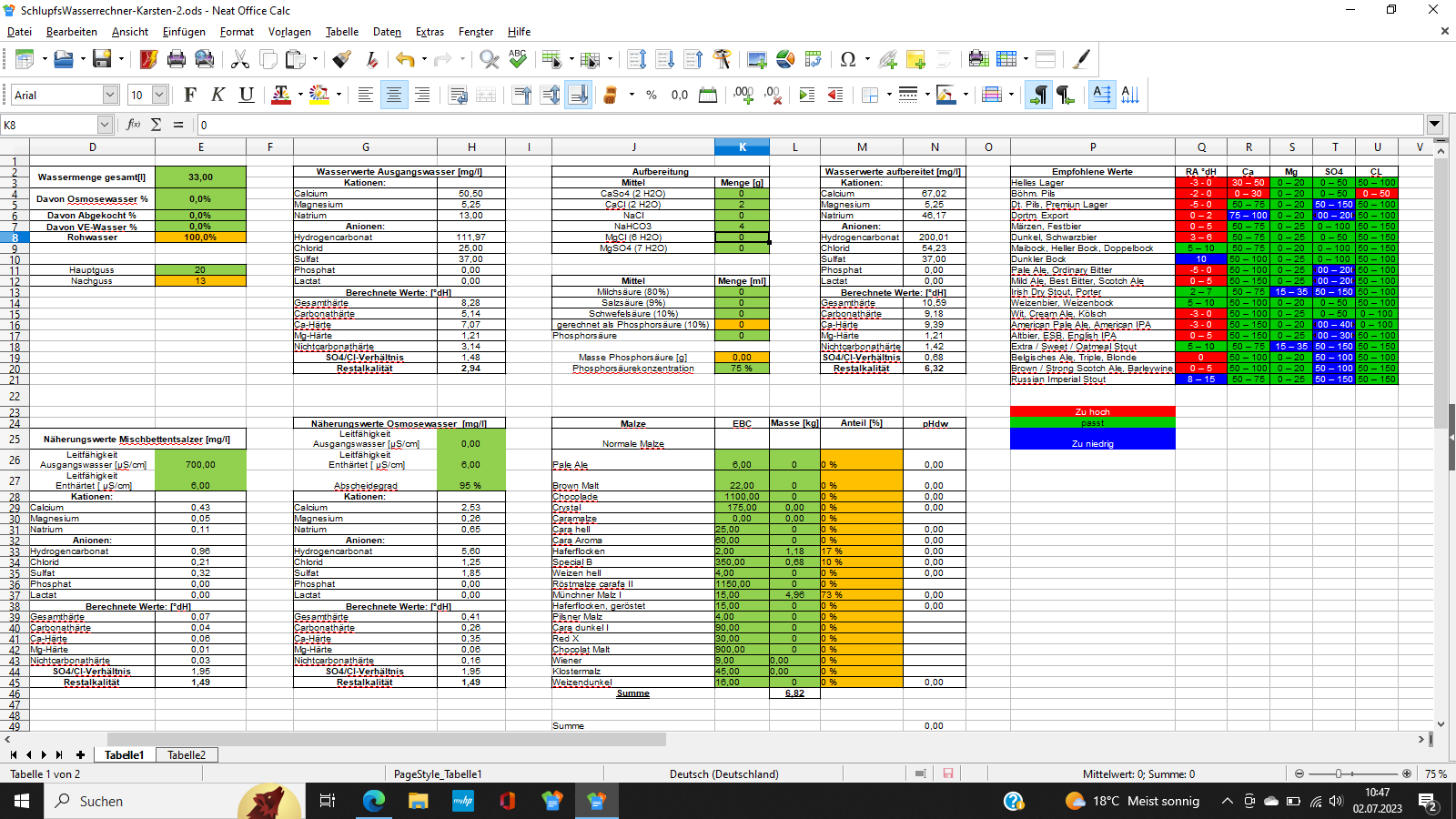 Die Zielwerte würde ich zu den empfohlenen Werte laut Tabelle rechts hinbekommen. Sind auch die Werte laut Braumagazin.Münsterland-Brauer hat geschrieben: Sonntag 2. Juli 2023, 10:29 Allerdings würde mich noch interessieren auf welche Zielwerte hin Du optimieren möchtest. pH ist klar, und die übrigen Werte „einfach“ auf ein starkes Ale hin optimiert ohne die gängigen Grenzen zu reißen und Salzgeschmack zu erzeugen?