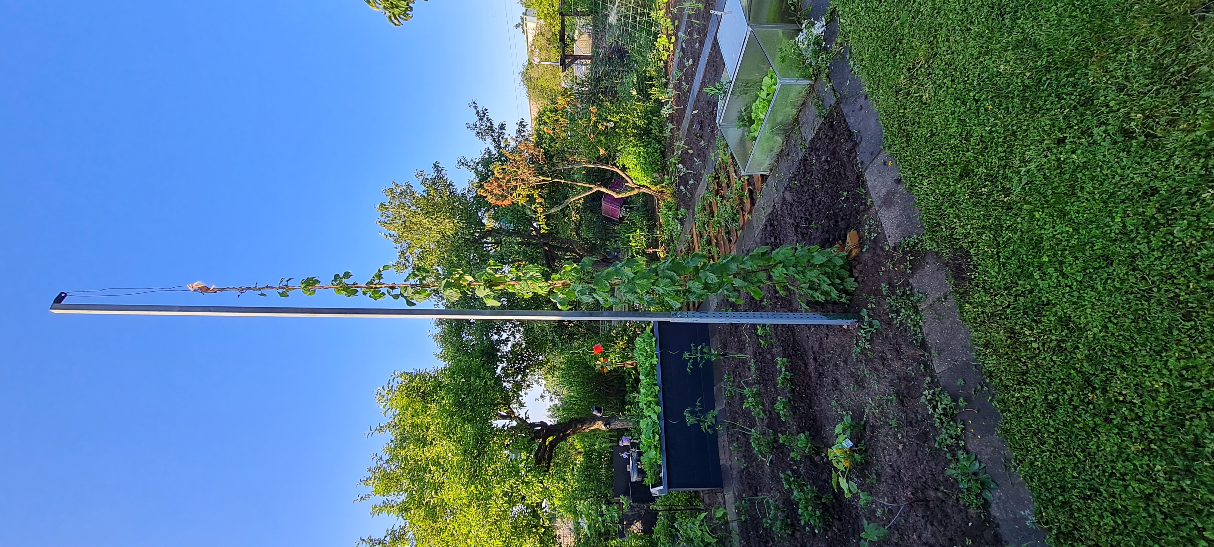 Das wird so nix. Der Hopfen wächst ja nicht nur an Seile oder Stangen, sondern auch am Boden als Haufen. Der Hopfen kennt nur die Schwerkraft, die Wuchsrichtung ist entgegen dieser. Gibt es was zum "Festhalten" wird dies genutzt. Wenn der Hopfen eben unabhängig davon wachsen soll, also parallel zum Boden, dann muss er entsprechend immer wieder angeleitet werden. Da dies nicht seine bevorzugte Richtung darstellt wird das Wachstum etwas gebremst.Bobby hat geschrieben: Dienstag 6. Juni 2023, 11:16 Nun habe ich ein Kletterseil angebracht, dass sich nach 2 m höhe um 45° abnkickt und nach Süden schaut.