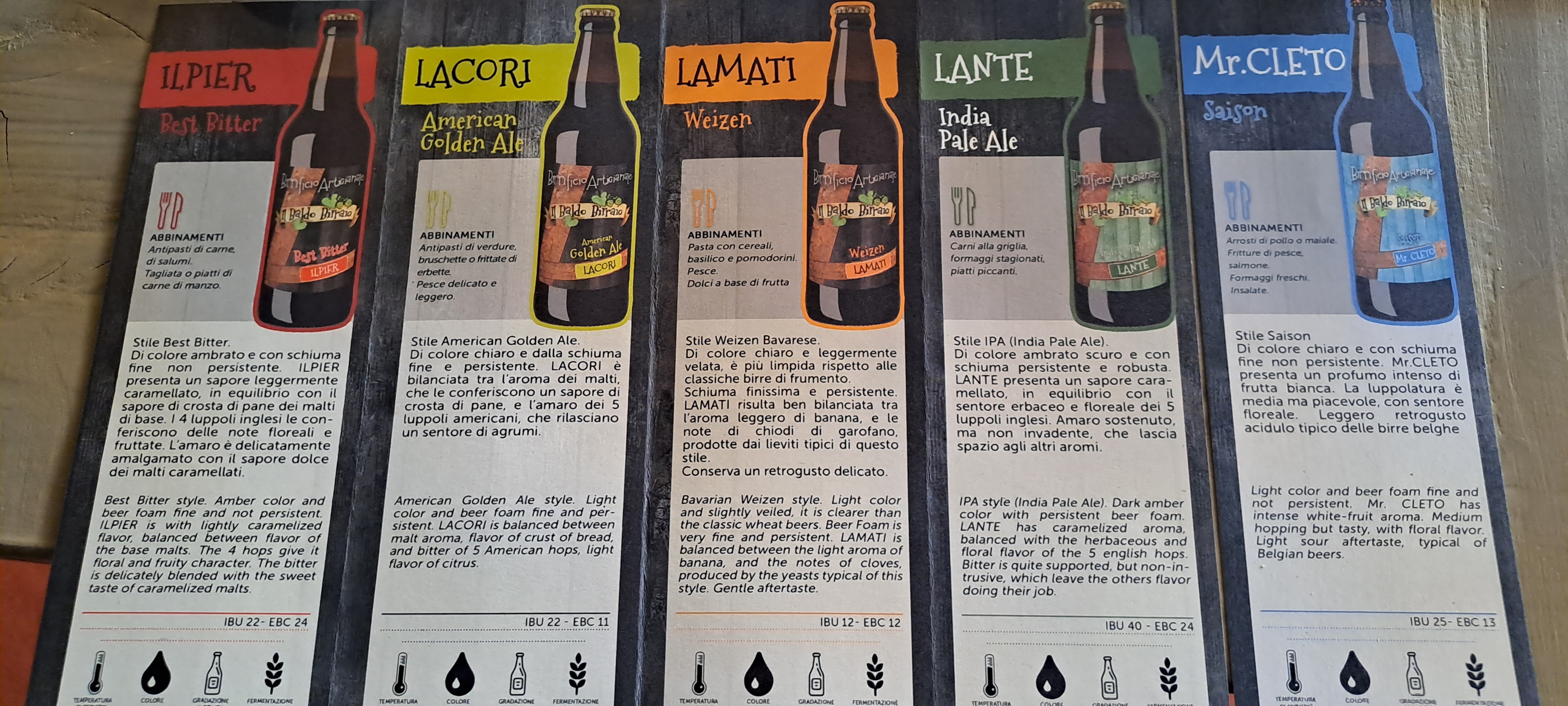 Das Ilpier (Best Bitter) und das Lacori (American Golden Ale) finde ich sehr gelungen. Das Lamati (Weizen) ist ok, aber es hat wenig von einem Weizen. Z.b. ist es völlig blank und die Bananen- und Nelkennoten kann ich auch nicht entdecken. Bei einer Blindverkostung hätte ich es nicht als Weizen erkannt. Das Mr. Cleto ist mir für ein Saison zu herb und die Fruchtaromen finde ich auch nicht. Das LaStout ist leider aus, aber als Flasche zum Mitnehmen verfügbar. Teste ich dann später. Lacasta ist ein Brown Ale mit Kastanien. Ich habe selbst letztes Jahr einen Maronenbock gebraut, daher bin ich auf diese Interpretation sehr gespannt. Und ich finde es sehr gelungen. Nicht so üppig wie mein Bock, daher sehr drinkable. Das Lante (IPA) gefällt mir auch sehr gut. Knackige Hopfenbittere ohne Schnickschnack.