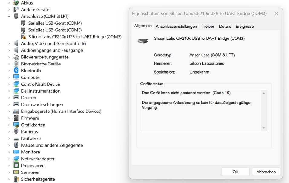 Ich scheitere schon an der Treiberinstallation - im Gerätemanager kommt der nicht an. Das Problem liegt mutmaßlich daran, dass ich es nicht schaffe aus der downgeloadeten Treiber-zip-Datei "CP210x_Universal_Windows_Driver" den Treiber zu installieren. Ich werde einfach nicht schlau aus der hinterlegten Anweisung in der Datei "CP210x_Universal_Windows_Driver_ReleaseNotes.txt".