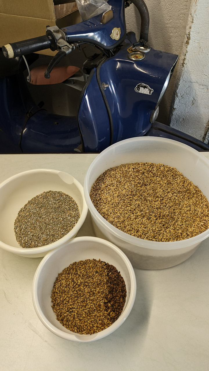 Heute wurde die Ale-Variante gebraut. Selbe Schüttung; beim Hopfen aus Mangel an Vorräten ein wenig Trickserei mit Ersatztypen.