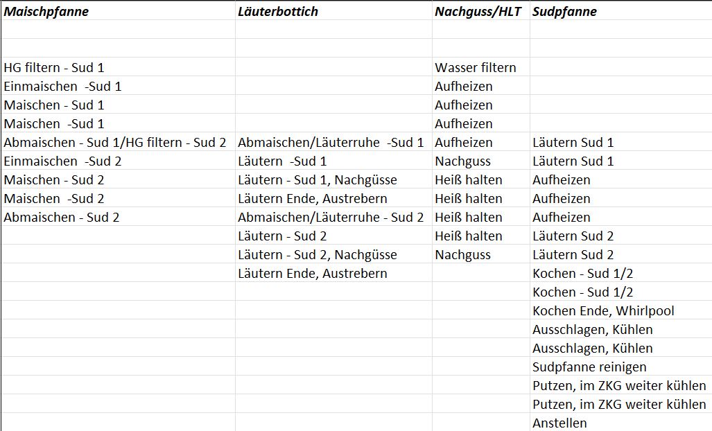 Dann hab ich mich etwas unklar ausgedrückt. Hier zum besseren Verständnis mal der angedacht Ablauf in Tabellenform: Es läuft also immer nur ein Maischprogramm zu einer Zeit. Zwei Maischprogramme laufen hitereinander/sequentiell ab. Aber: Es soll halt gleichzeitig während des 2. Maischens schon zum kochen aufgeheizt werden. Und nicht wie sonst üblich erst nach dem Maischen gekocht werden.Innuendo hat geschrieben: Mittwoch 26. Juli 2023, 08:51 Ich habe Deine Frage nach zwei parallelen Maischeplänen auf 2 oder mehr Kettles verstanden.