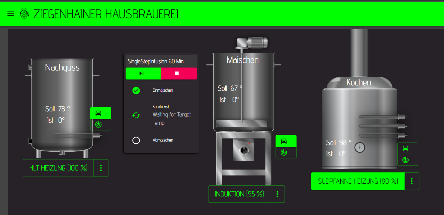 Damit wären dann Maischen und Nachguss schon erschlagen. Und wenn man dann noch einen weiteren Kessel konfiguriert der das gleiche mit 100°C Zieltemperatur auch macht wäre doch auch die Sudpfanne erledigt, oder?mrhyde hat geschrieben: Mittwoch 26. Juli 2023, 19:44 Dann läuft z.B. im Maischekessel dein Maischeprogramm ab und der andere Kessel heizt bis zur gewünschten Temperatur und hält sie dann (z.B. 78°C)