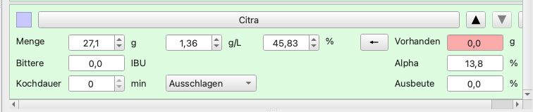 Der Hopfen stand nicht mehr in der Zutatenliste, hatte einen anderen Alphawert. Nachdem ich die Hopfen getauscht hatte im Rezept, lassen sich die IBU Werte nicht mehr berechnen. "Ausgleichen", bzw. der "+xy%" Knopf funktioniert nur in der ersten Hopfengabe (die wurde aus dem alten Rezept übernommen). Ich muss also den Kochen Plan neu aufsetzen.