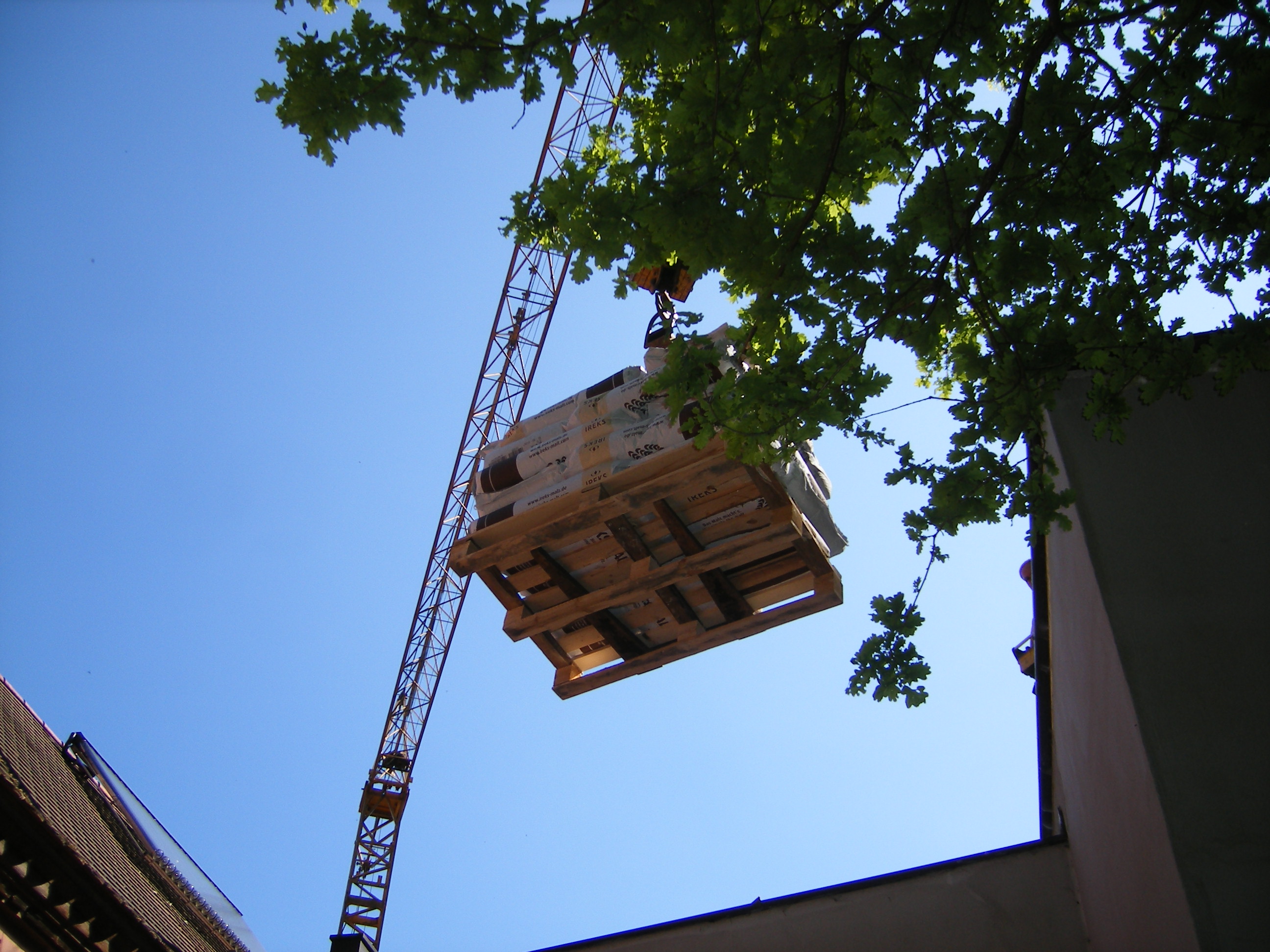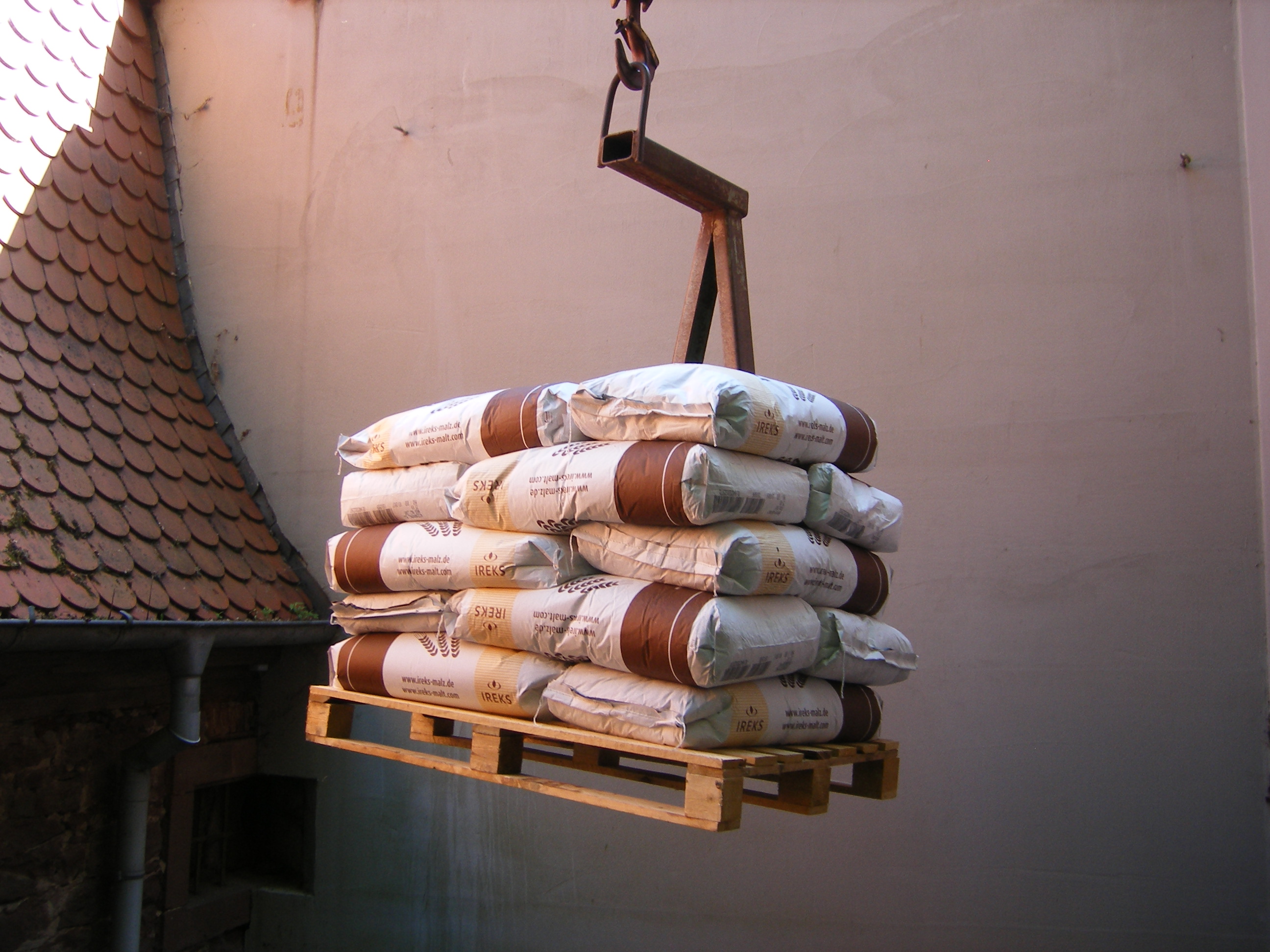 15 Säcke Malz a 25kg von IREKS Malz in Kulmbach ( alles perfekt gelaufen, superfreundlich, kann ich sehr empfehlen ), vom LKW auf Palette, mit dem Kran in den 2. Stock vor die Treppe.