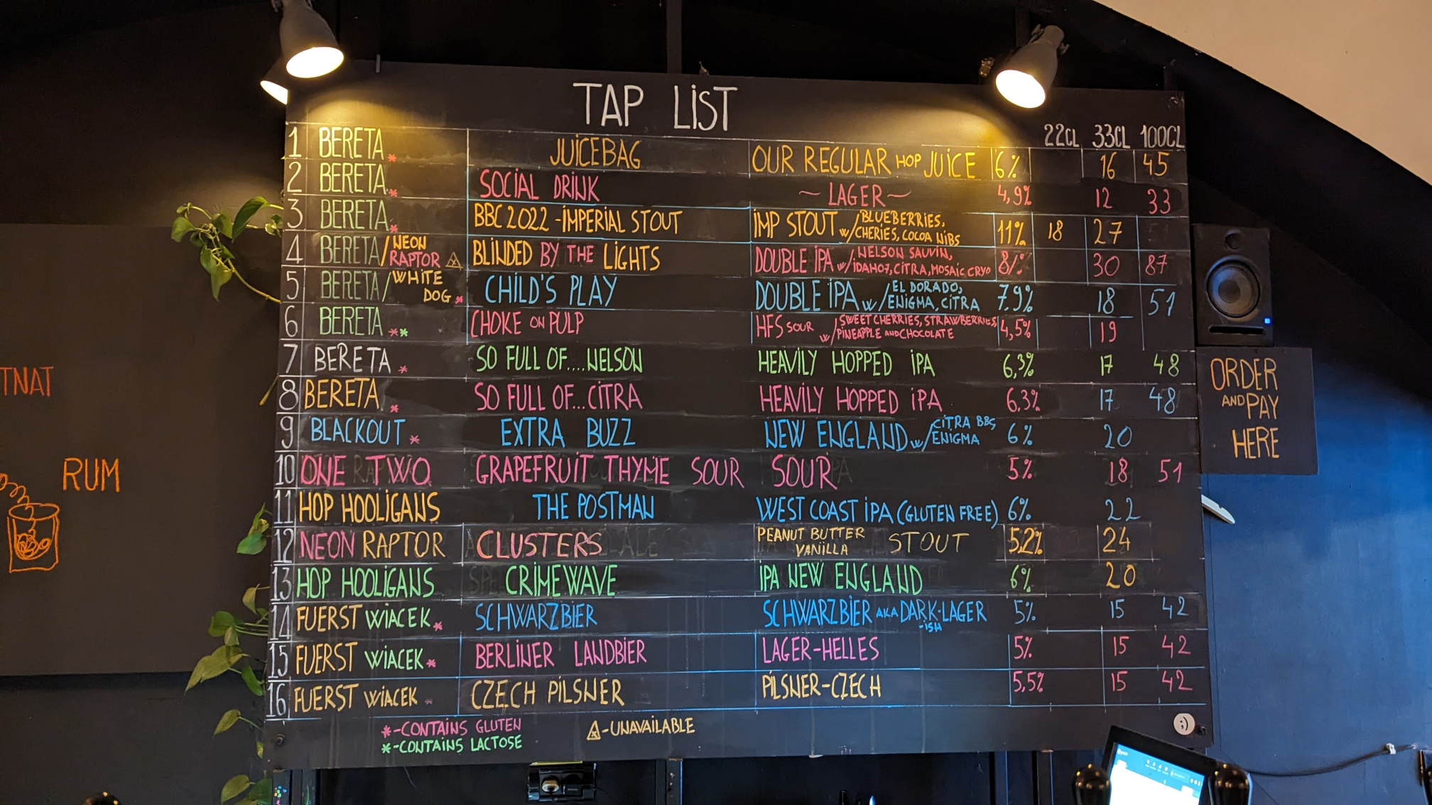 Die Biere sind eine absolute Empfehlung, sodass ein Besuch absolut nicht ausreicht, um sich ein Bild von den Braukünsten der beiden Braumeister machen zu können. Ebenso sollte man rechts neben der Bar den Bottleshop besuchen, der weitere Spezialitäte von Bereta und anderen Herstellern beherbergt.
