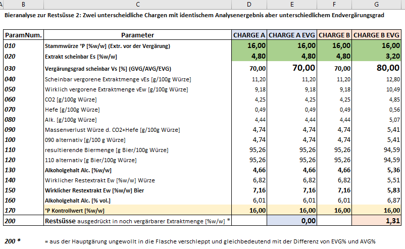 Die Charge B trägt je 100 g Bier noch 1,3 g vergärbare(G200), aber nicht vergorene Extraktmenge ein. Diese noch vergärbare Extraktmenge besteht zumeist aus Einfach-, Zweifach und ggf. aus Dreifachzuckern und diese Fraktion schmeckt deutlich süßer als die Dextrin-Pendanten, die für gewöhnlich den nicht vergärbaren Extraktanteil ausbilden.