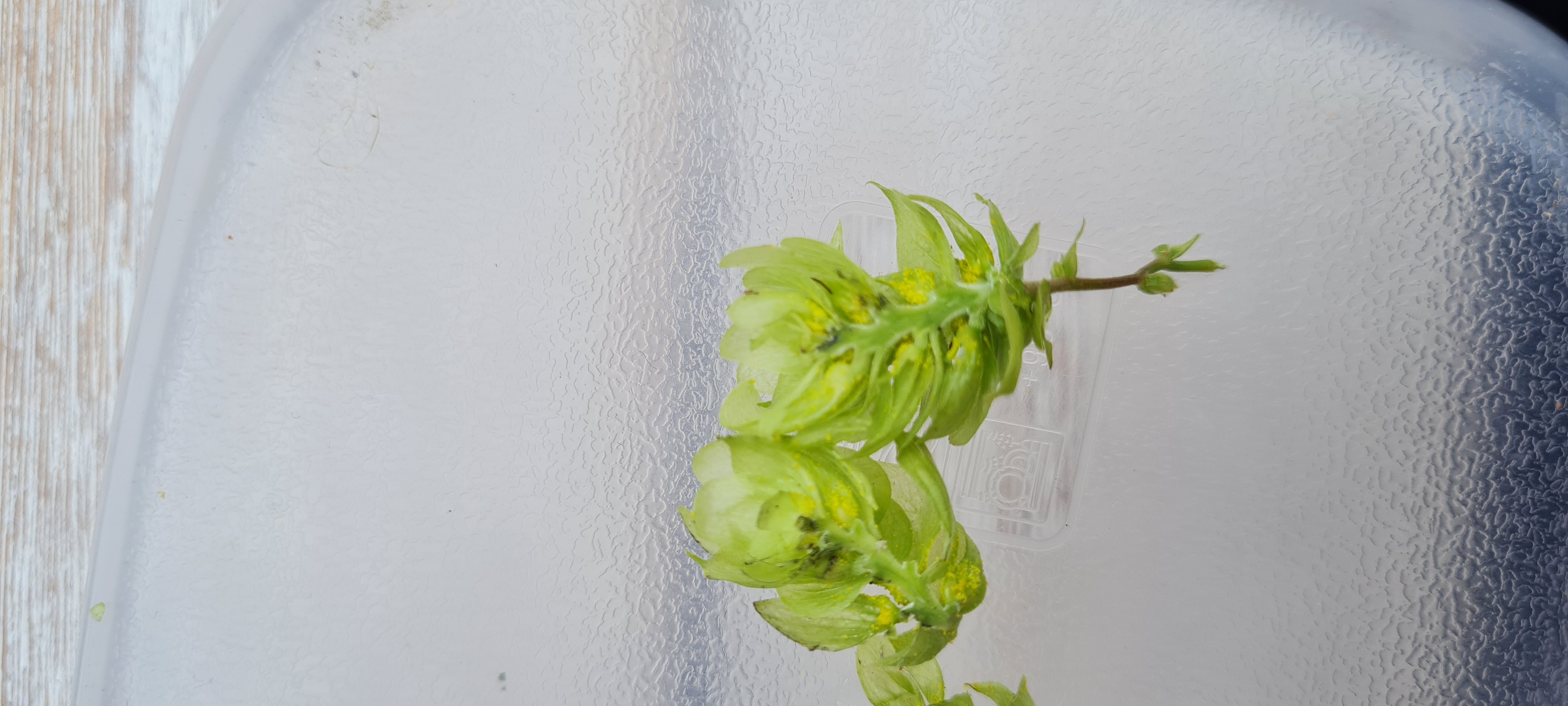 Du kannst selbst prüfen: Nimm eine Dolde mit brauner Spitze. Wenn sie beim Umknicken knackt und das Lupulin In Kügelchen zum Vorschein kommt und klebrig ist, ist Erntezeit. Wenn du dann zu lange zuwartest, verschenkst du Aroma! Oder du erntest sukzessive…
