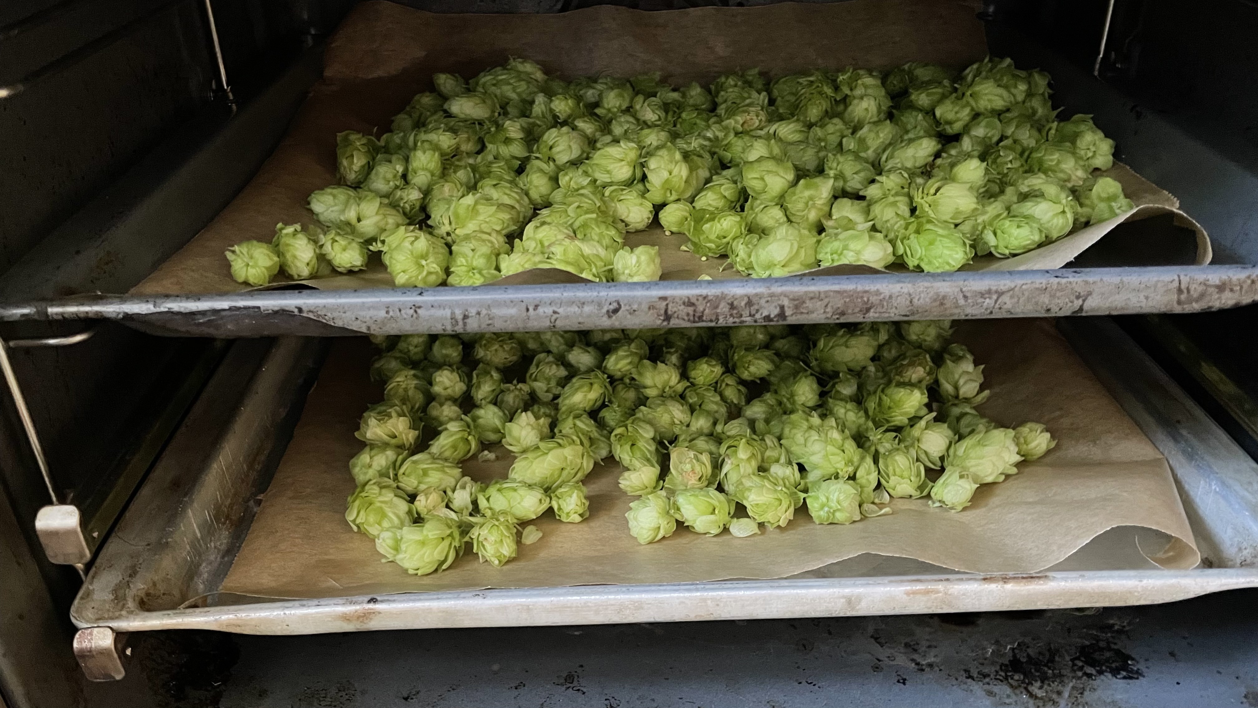 Das Deutsche Hopfeninstitut geht von 80 % Wassergehalt bei Ernte aus. Es spricht von 62 - 68 °C bei drei bis vier Lagen in 3 - 5 Stunden in Abhängigkeit von den Dolden. Das stelle ich im Kleinen seit Jahren in meinem Ofen mit Darrfunktion erfolgreich nach. Der Duft wird gesteigert, die Dolden kleben stärker. Ich verwende dazu die Einstellung Dörren, das ist Heißluft, die ständig die Richtung wechselt, was eine gleichmäßige Trocknung begünstigt. Ich habe 5 Stunden bei 62 °C getrocknet und damit 75 % Feuchtigkeit entzogen, also Restfeuchte 20 %. Im Anschluss wird sofort vakuumiert.