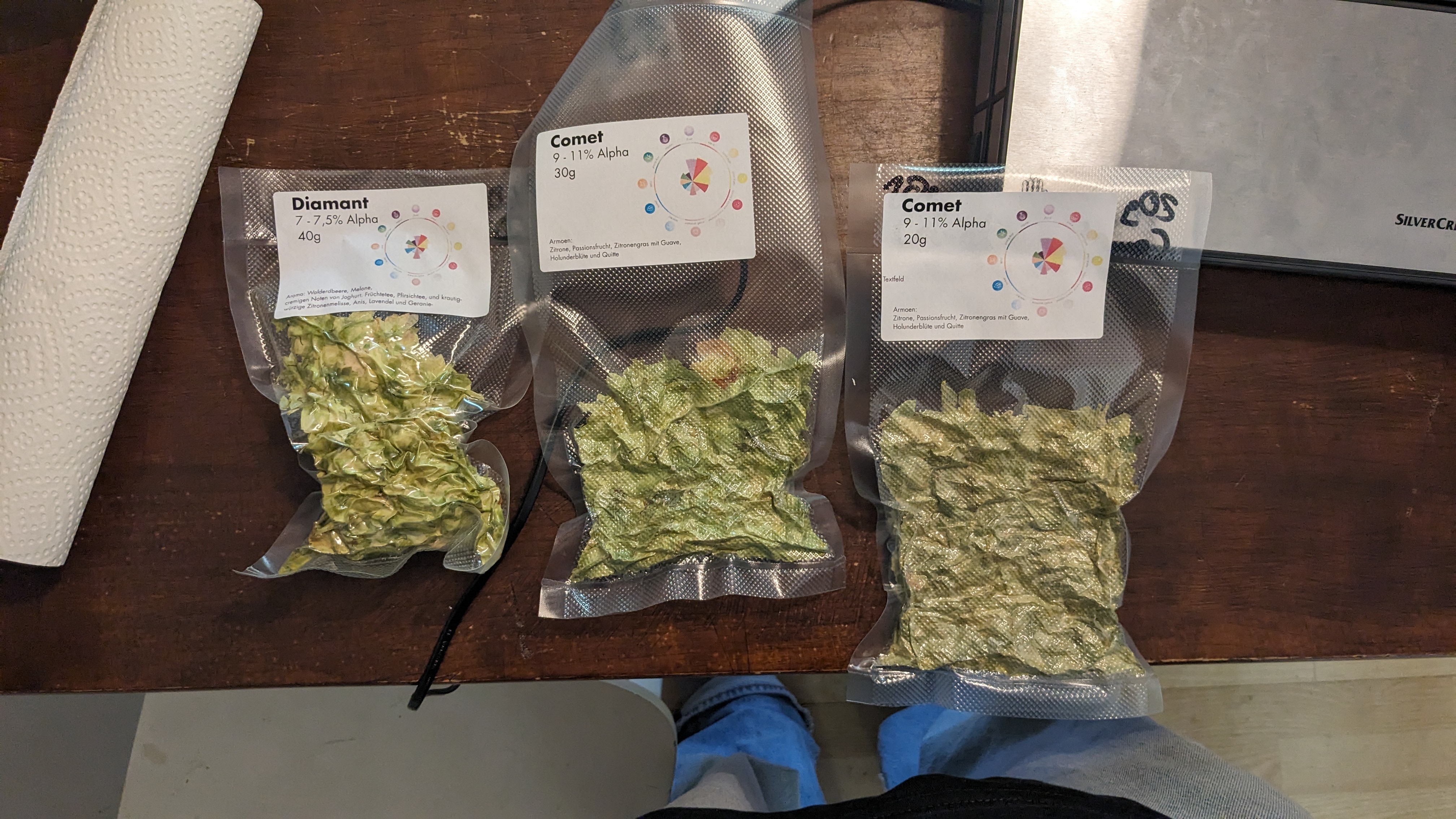 Habe also kurzen Prozess gemacht, Zutaten bestellt, die Vorderwürzehopfung mit Pellets (Tradition, nach Rezept) durchgeführt und spät im Kochprozess die zehnfache Menge Grünhopfen gegeben.