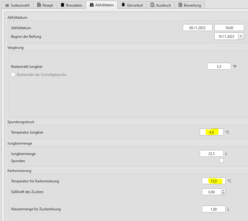 Temperatur Karbonisierung: Temperatur für die Berechnung der benötigten Zuckermenge beziehungsweise Speise. Mit Hilfe dieser Temperatur wird berechnet, wieviel CO2 bereits im Jungbier gebunden ist. Typischerweise ist das die höchste Gärtemperatur.