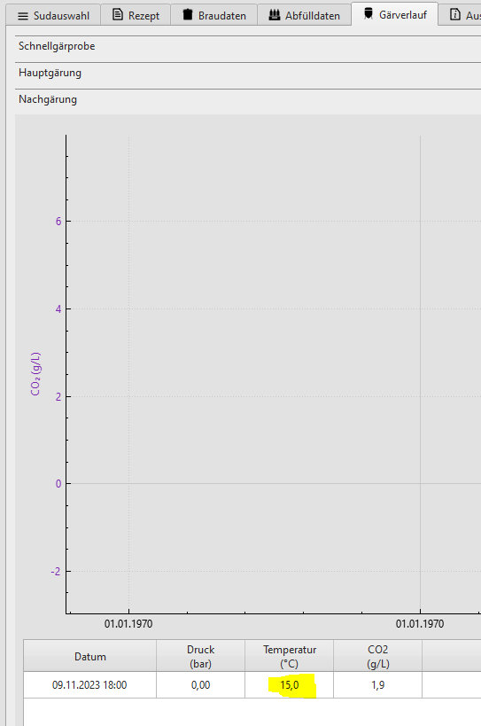 Wenn Du lustig bist, nimm den CC noch bei Gärverlauf Hauptgärung auf und ändere im Unterreiter Nachgärung die Temperatur. Das wirkt sich auch auf den Reiter Abfülldaten und den Graphen aus. Meines Erachtens ist alles an Bord.