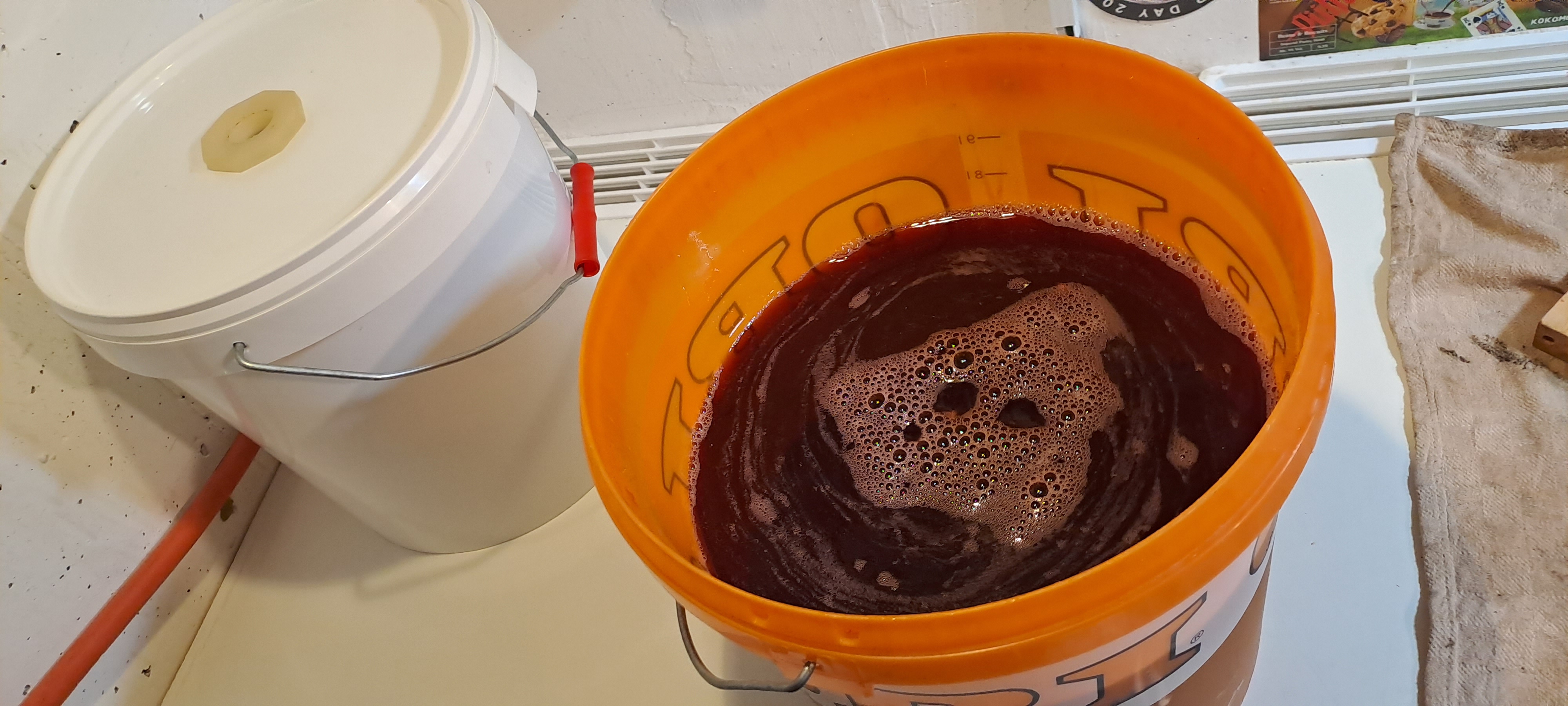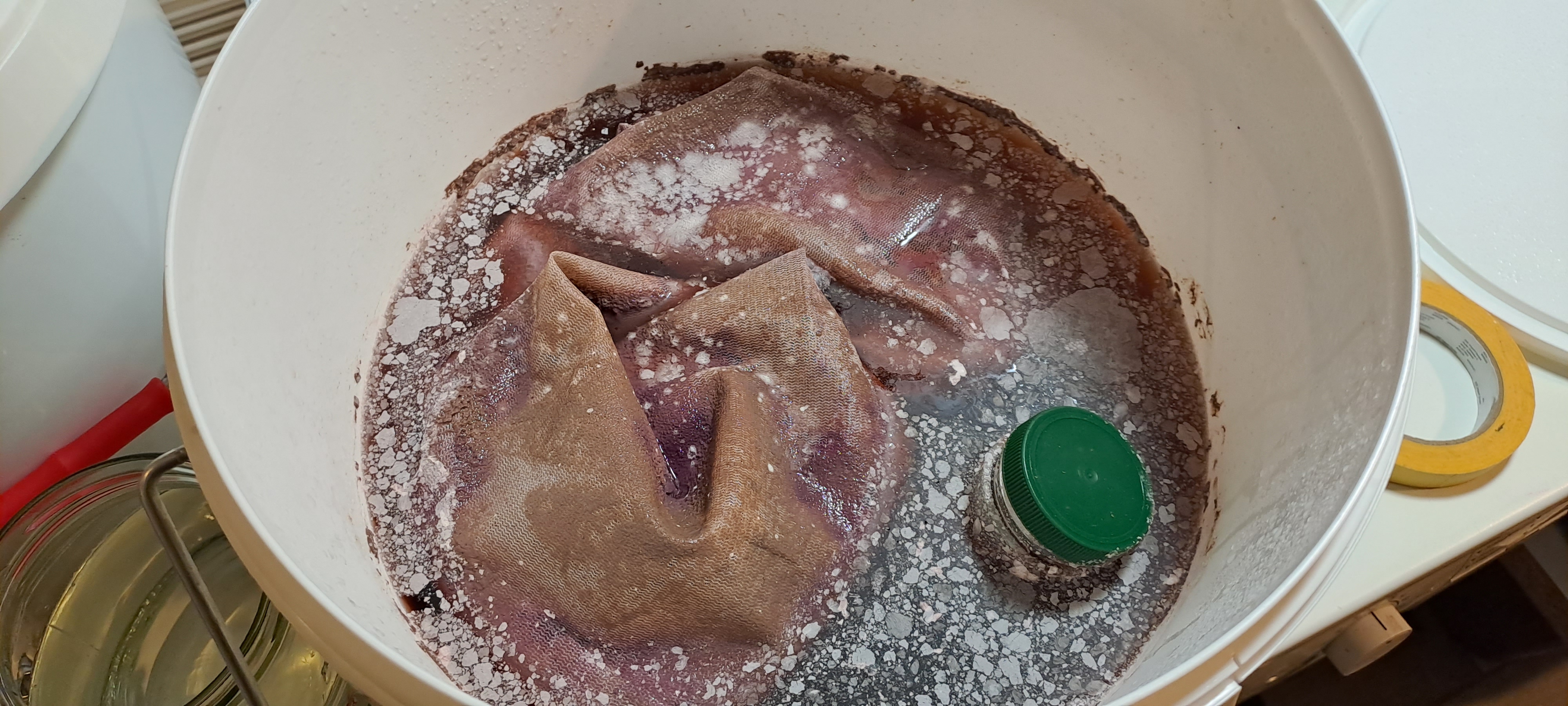 Ein sehr entspannter Brautag geht zu Ende. Traubentrester vorgelegt, Würze und Hefe rein und dann den Saft drauf. 20l @1.073 SG. Und kurz vor Schluss noch fast die Hefe für den linken Eimer vergessen. 😱 Das wäre eine sehr spannende Wildvergärung geworden... 😉