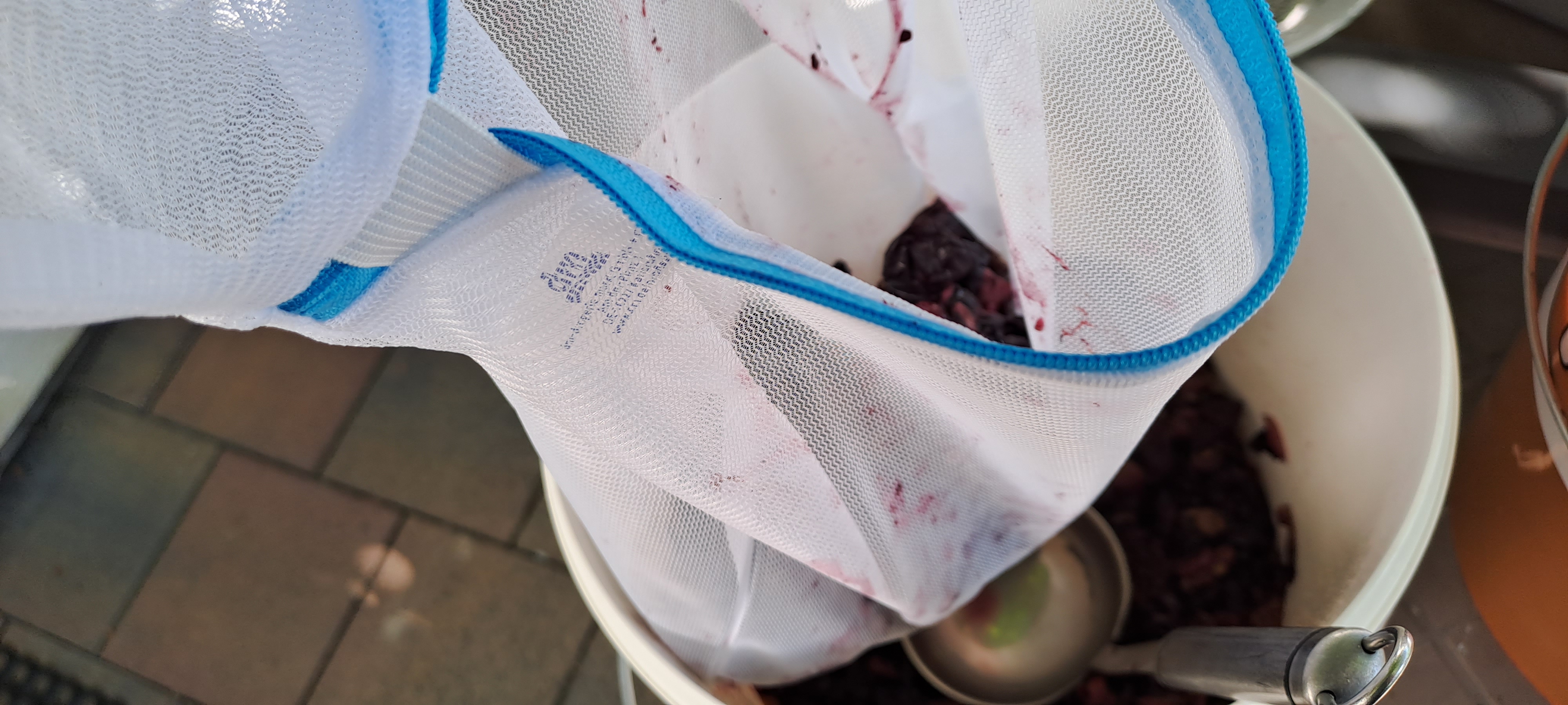Ich habe die Trauben eben gepresst. Es kamen 7 Liter Saft bei 13°Brix dabei raus. Ich habe die Trauben nicht bis zum letzten ausgequetscht. War auch so schon eine ziemliche Sauerei...