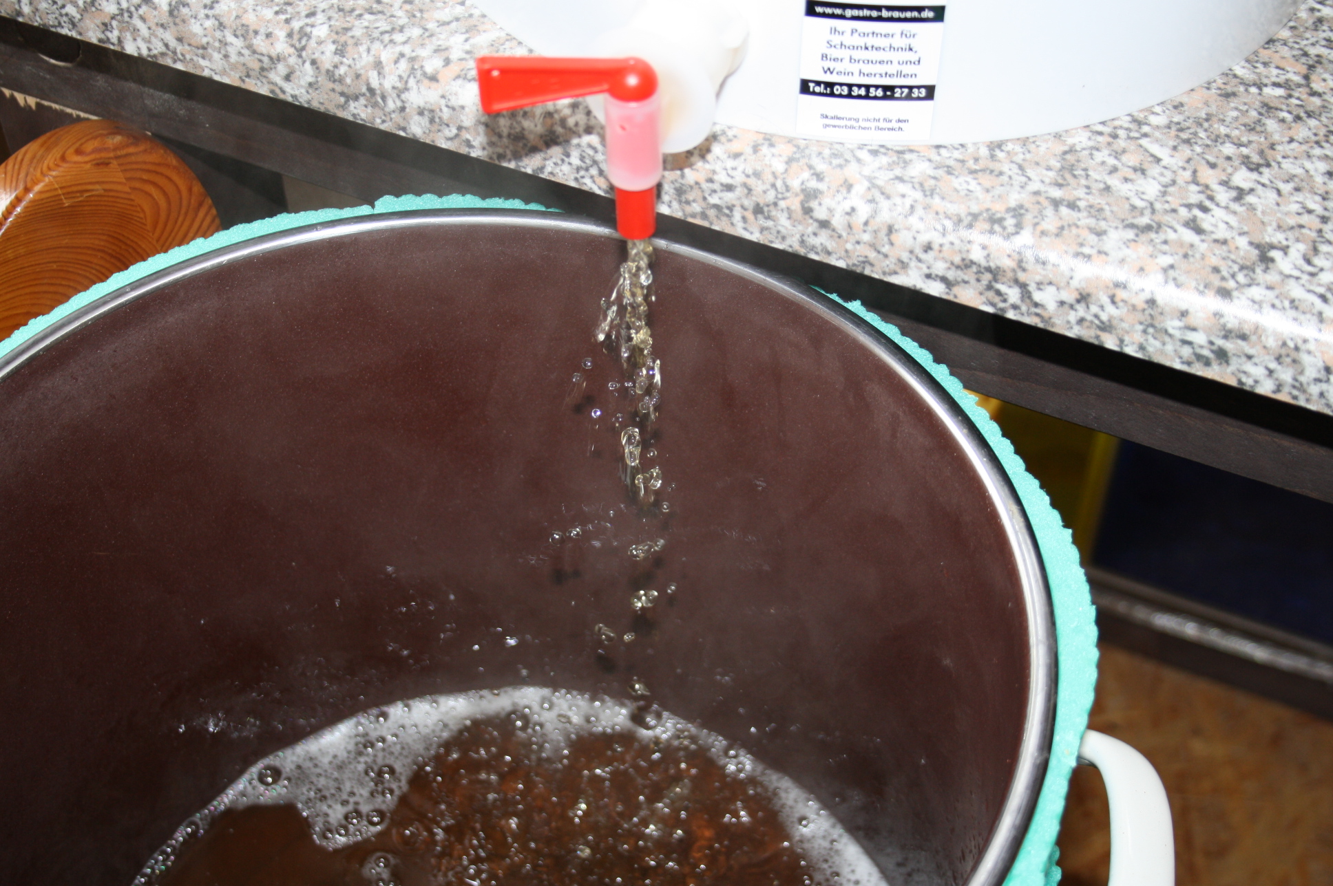 Entnehmen sie den Hopfen und kühlen sie die Würze auf Anstelltemp. . Fals sie weniger als die oben angegebene Liter Würze haben, verdünnen sie die Würze mit kaltem Wasser auf das angegebene Volumen. Stellen sie nun die Würze mit Hefe an.