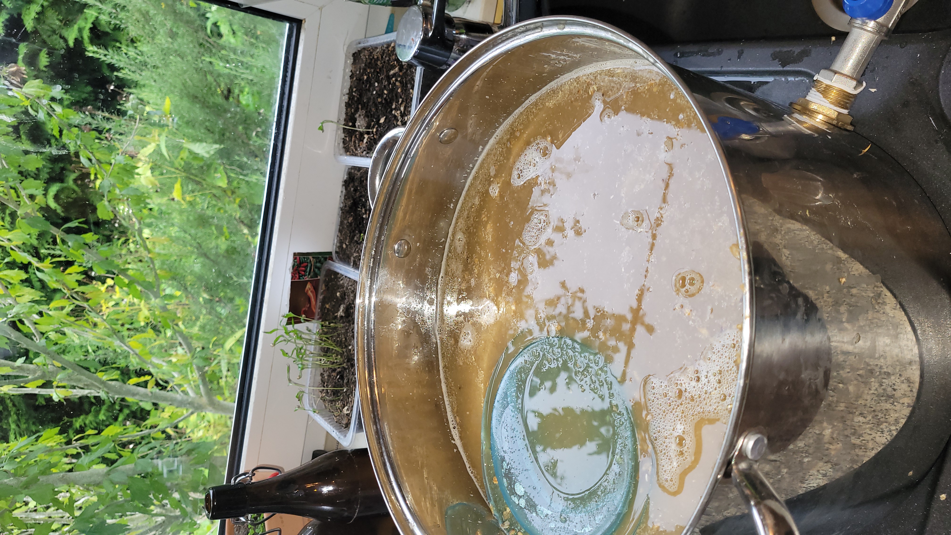 Aber mal ein paar technische Frage zum Thema Läutern. Beim ersten Sud hab ich noch mit einem BIAB Sack geläutert und gedacht, das klappt schon. Anfangs dachte ich dass ein Teil des Trubes dann beim Lagern noch sedimentiert. Hat er nur bedingt geklappt. Das Bier sah doch verhältnismäßig nach einem NEIPA aus. Der zweite Versuch war dann mit einem selbstgebastelten Läuterbottich aus großem Kochtopf, Wasserhahn und Spiralfeder.