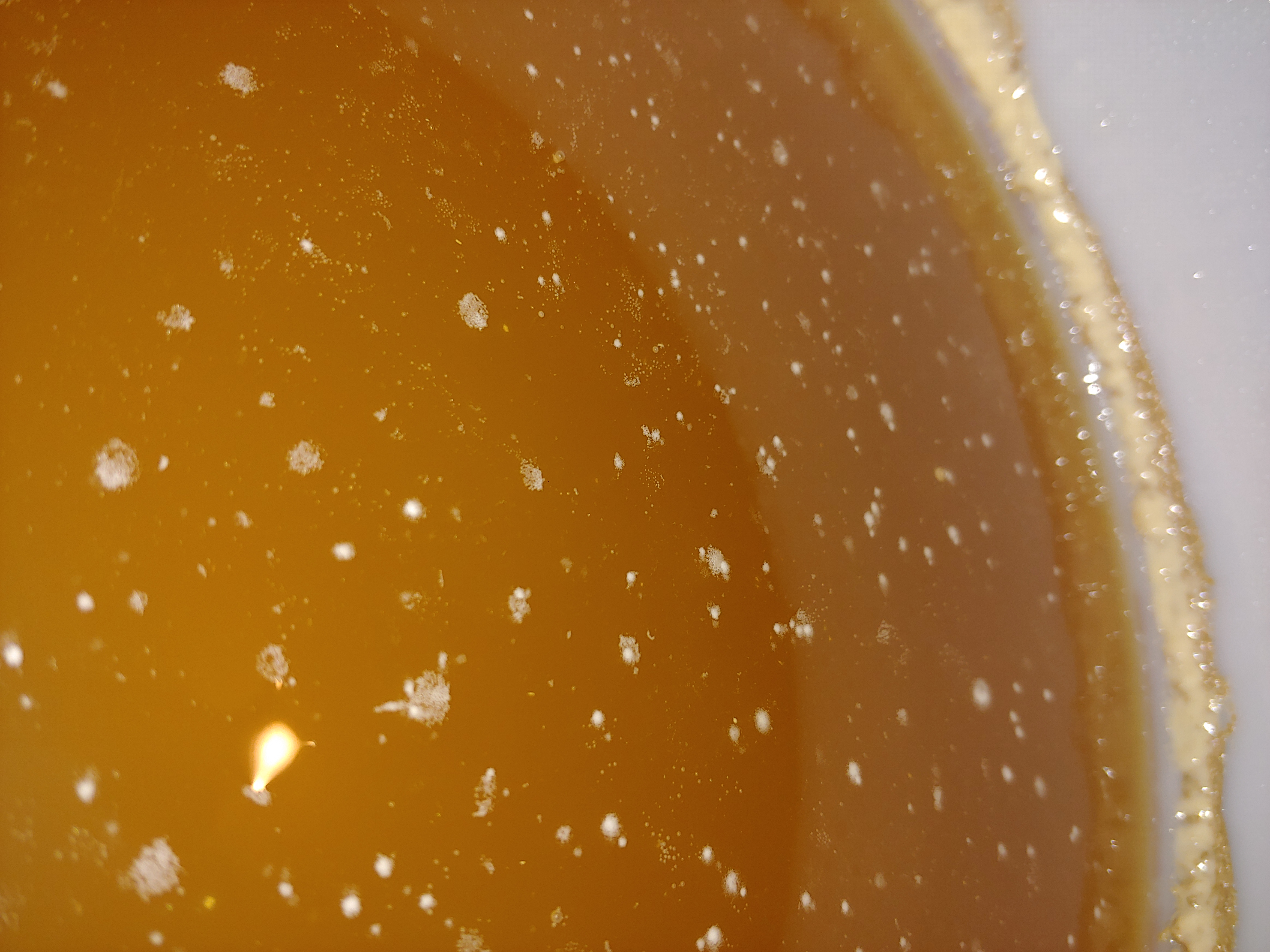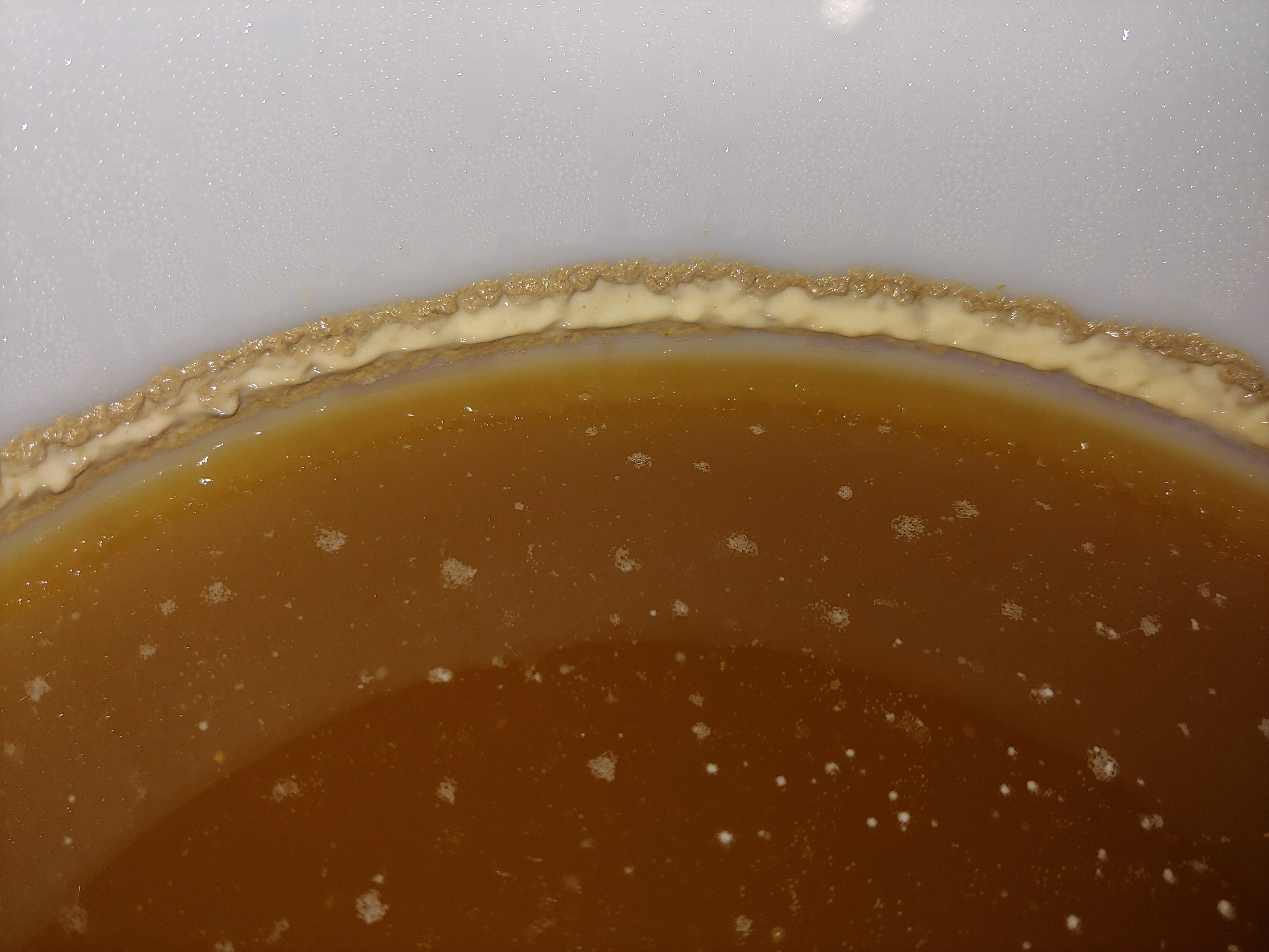 So sieht es im Gärbottich nach der Gärung aus. Das auf der Oberfläche sind noch einzelne Hefeinseln und wie von Kurt bereits geschrieben, am Rand die Brandhefe. Fertig zum Abfüllen würde ich da sagen