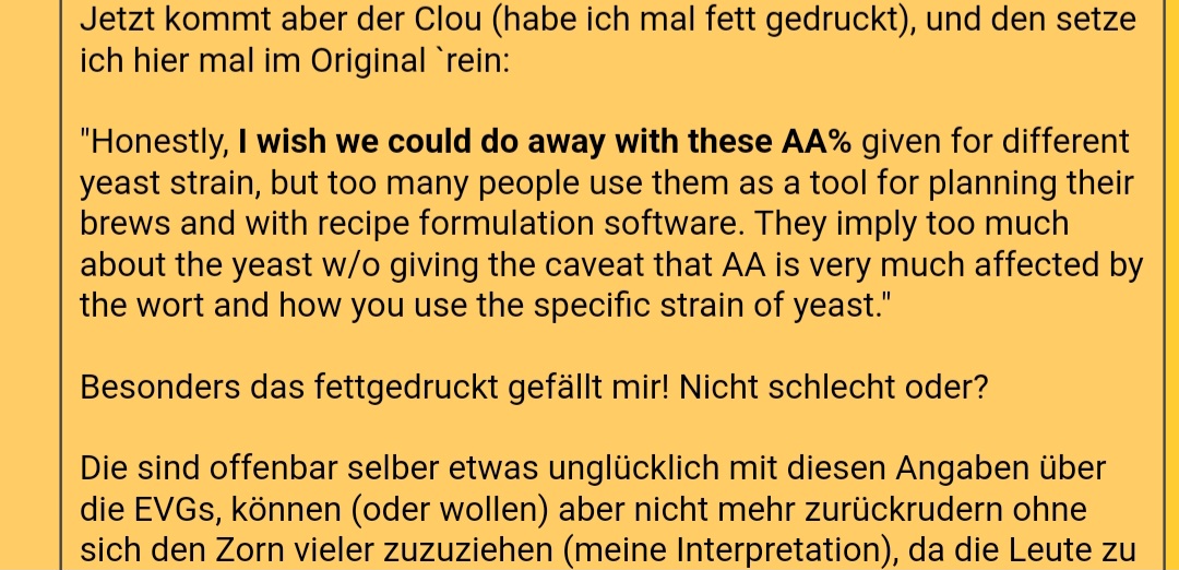 [OT an]jaulinho hat geschrieben: Montag 20. November 2023, 06:18 Es ist daher auch singfrei, über zu niedrige oder zu hohe Ausstoßvergärungsgrade einer Hefe zu reden, wenn man die Schüttung, die Rasten, die Anstellrate, die Gärführung und das Ergebnis der SVG nicht kennt.
