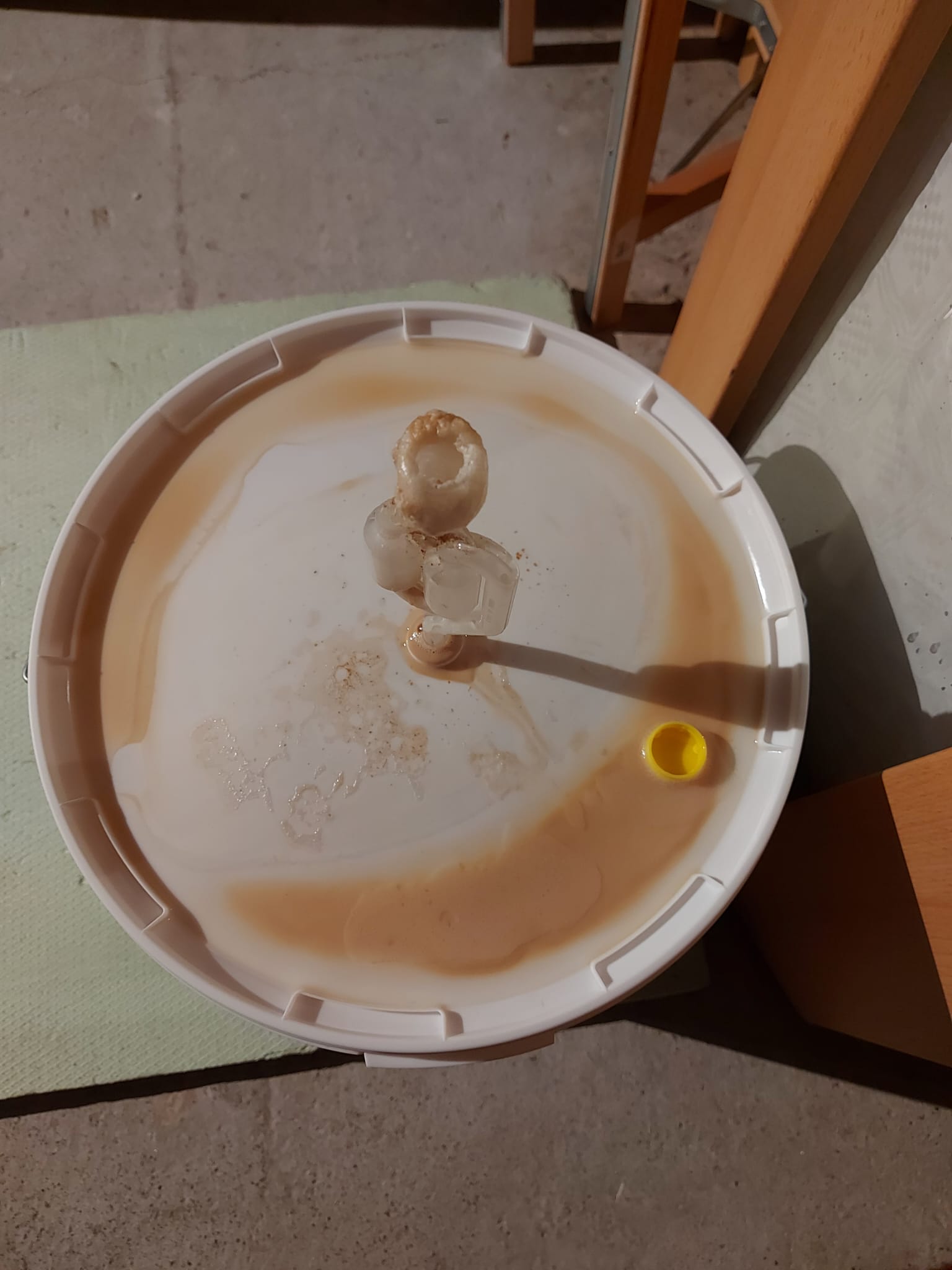 Vor 8 Tagen angesetzt. Nach 24h waren die Hochkräusen dann schon fast wieder durch. Gestern habe ich umgeschlaucht, und es war immer noch eine Kräusendecke drauf. Sie ist aber bereits bei 77% angelangt und anscheinend noch voll dabei: Das Jungbier war noch unglaublich Hefetrüb. Geruch ist ok, leicht Acetaldehyd, wundert mich jetzt aber nicht wirklich.