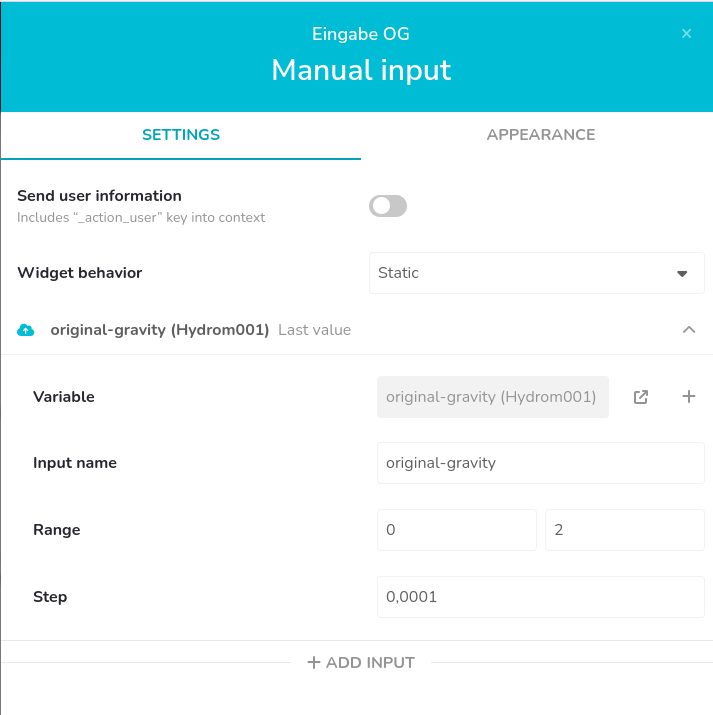 Ich habe mir eine neue "raw"-Variable namens "original-gravity" angelegt. Dafür musste ich allerdings eine andere löschen, da in der kostenlosen Version nur 10 Variablen möglich sind. "raw" deswegen, weil man synthetische Variablen nicht in der Formel einer weiteren synthetischen Variablen verwenden kann. Um den Wert einzugeben, gibt es das Widget "manual input", welches man dann mit der neuen Variablen verknüpfen und auf der GUI anzeigen lassen kann. Und dann noch die neue Variable in die Formel für die Berechnung des Alkoholgehalts einbauen.