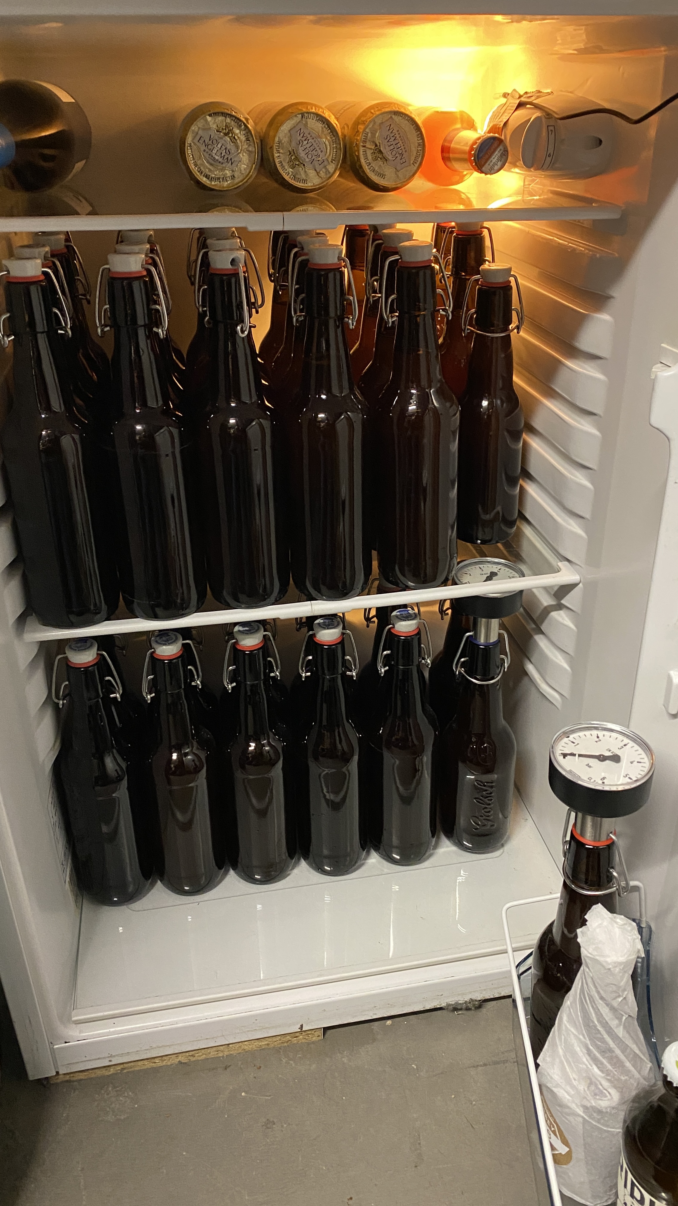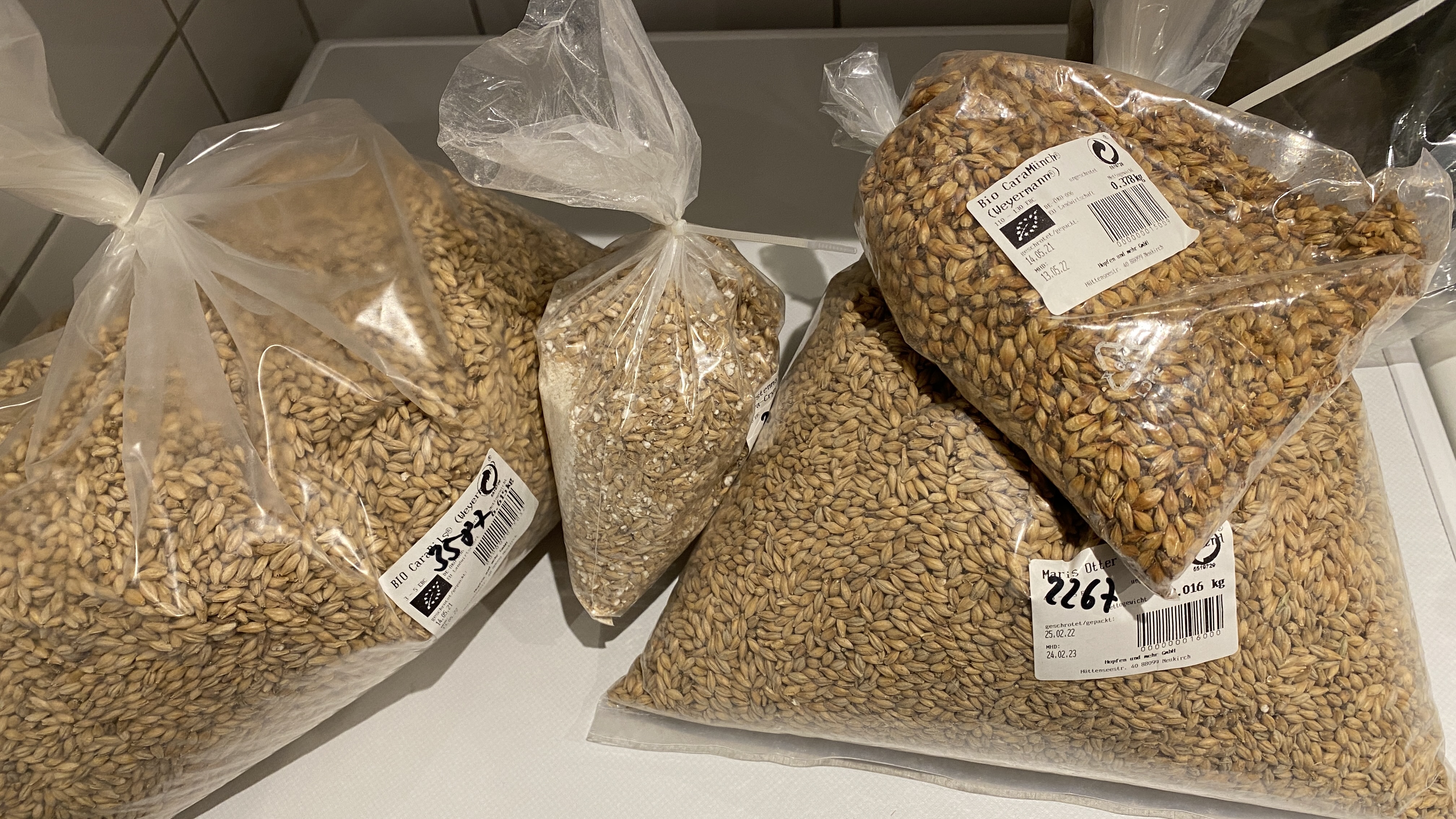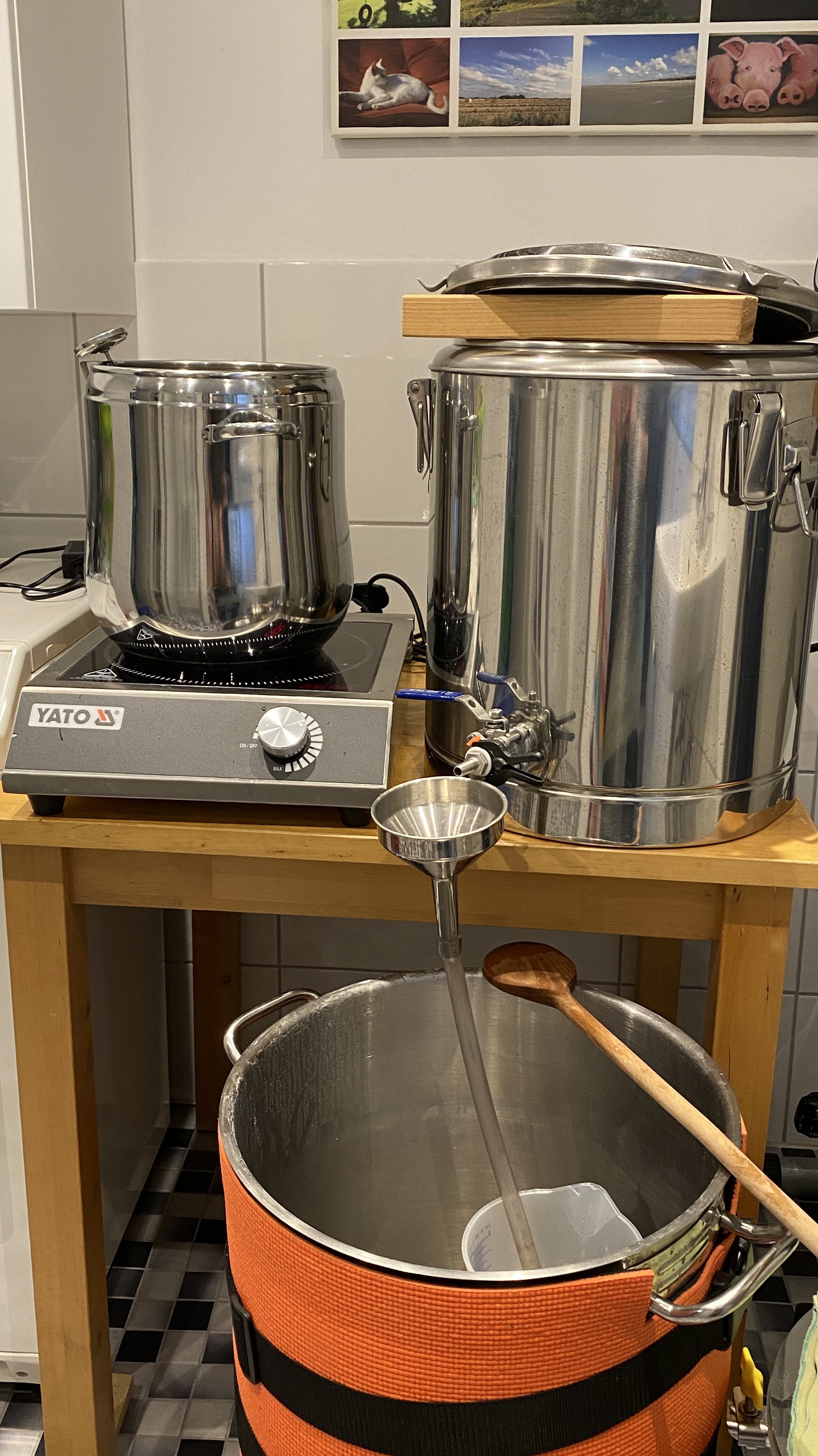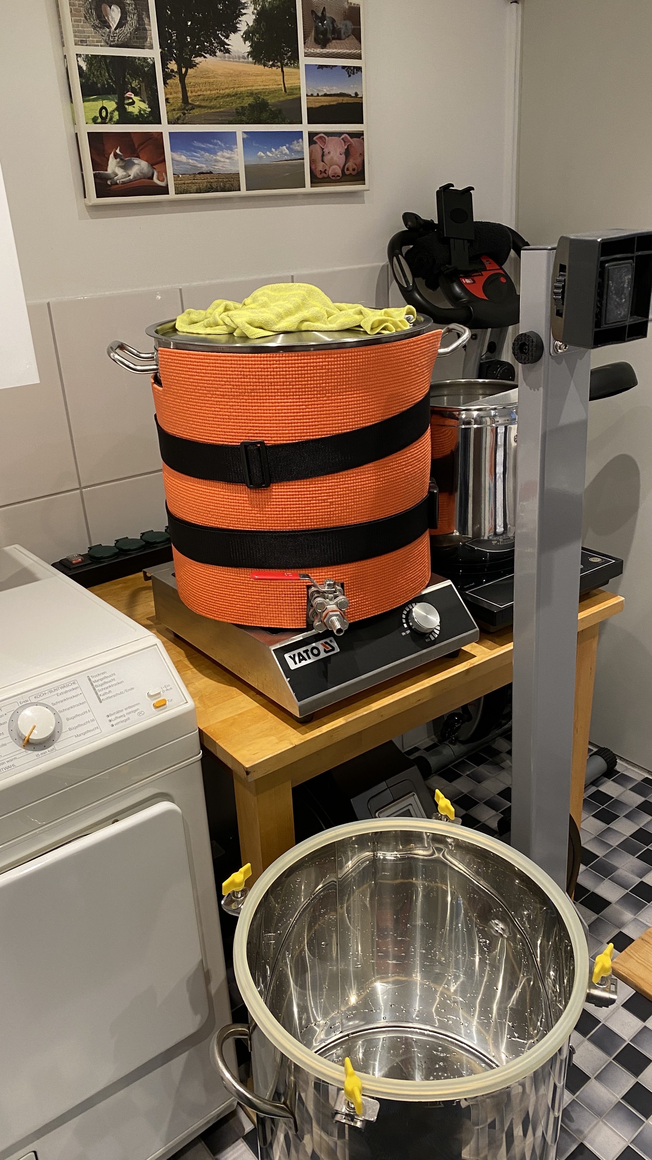 Nicht im Bild: Der Kühlschrank mit Gärfass, Inkbird WLAN gesteuert, ansteigende Temperatur von 12-14°C.