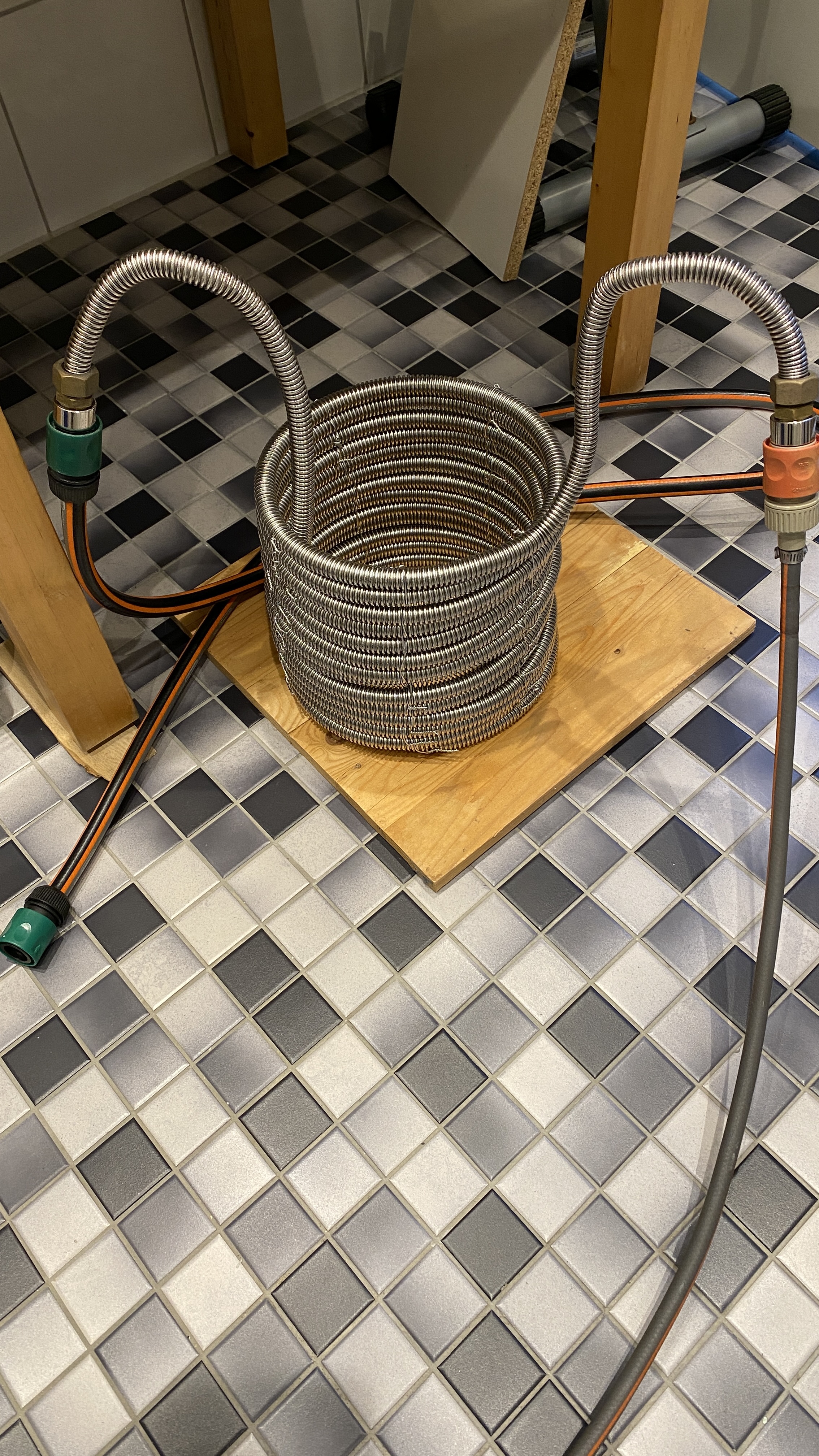 Kühlung installieren. Eigenkostruktion aus 10m Edelstahl Wellenrohr aus dem Solarbau. Klappt super!