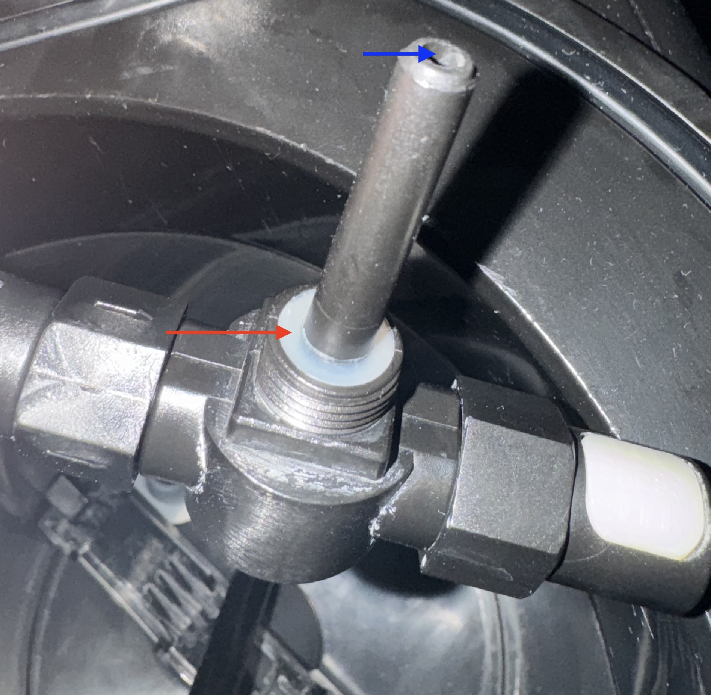 so wie Kalli es beschreibt. Die Dichtung kann die Löcher blockieren. der Blaue Pfeil ist auch der Getränkeausgang über den der Dwgen geachraubtbwird. So ein ähnliches Oroblem hatte ich neulich auch, das ließ sichvpber die Position der Dichtung dann lösen, nachdem ich da bestimmt 3 CO2 Kapseln vergeblich angeschlossen hatte.