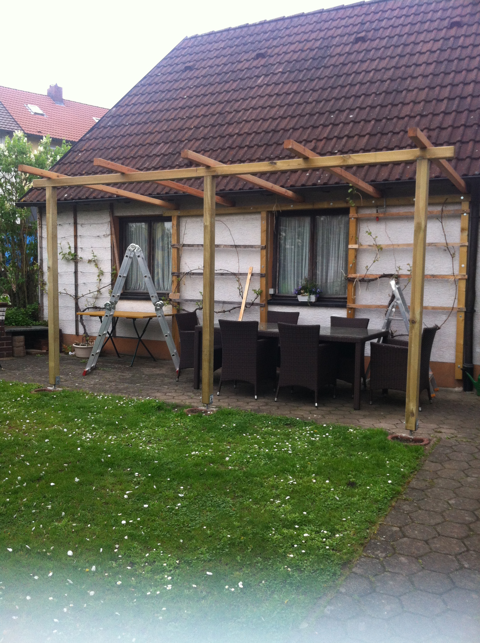Ich hätte die Möglichkeit hier Hopfen anzupflanzen: Unterhalb von den Balken in die roten Steinkästen würden die Pflanzen kommen.