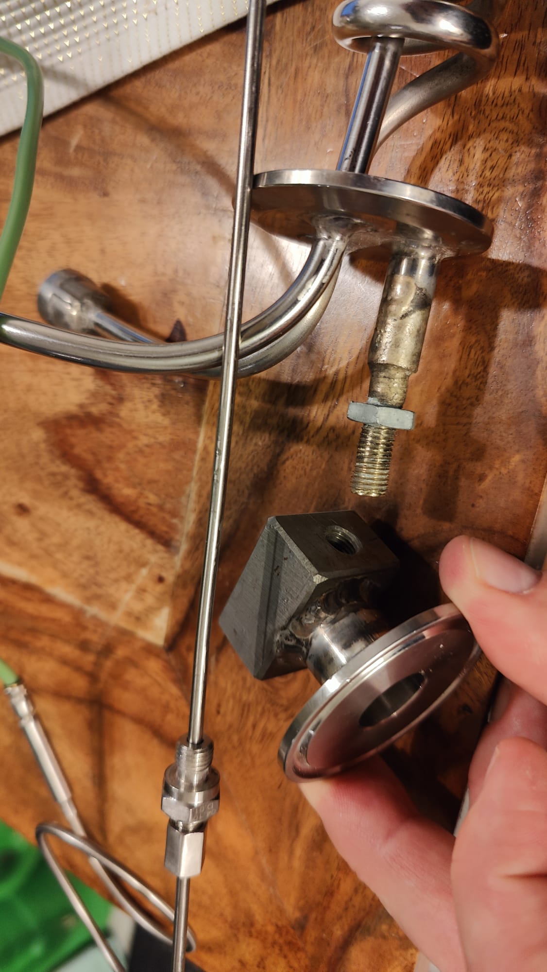 Drei Durchgänge im TC-Kopf, einer für die Durchleitung plus ein Sensor und zwei Durchgänge für eine fest angebaute Kühlspirale. Hier frage ich mich, ob und wie die Öffnungen von der Unterseite verschlossen werden kann/sollte. Einerseits ist klar, dass das Dreckecken sind, die man nie richtig sauber bekommen wird. Von der Oberseite ist das Ganze wie auf den Bildern verschweisst oder verlötet; koi Ahnig, bin kein Metaller.