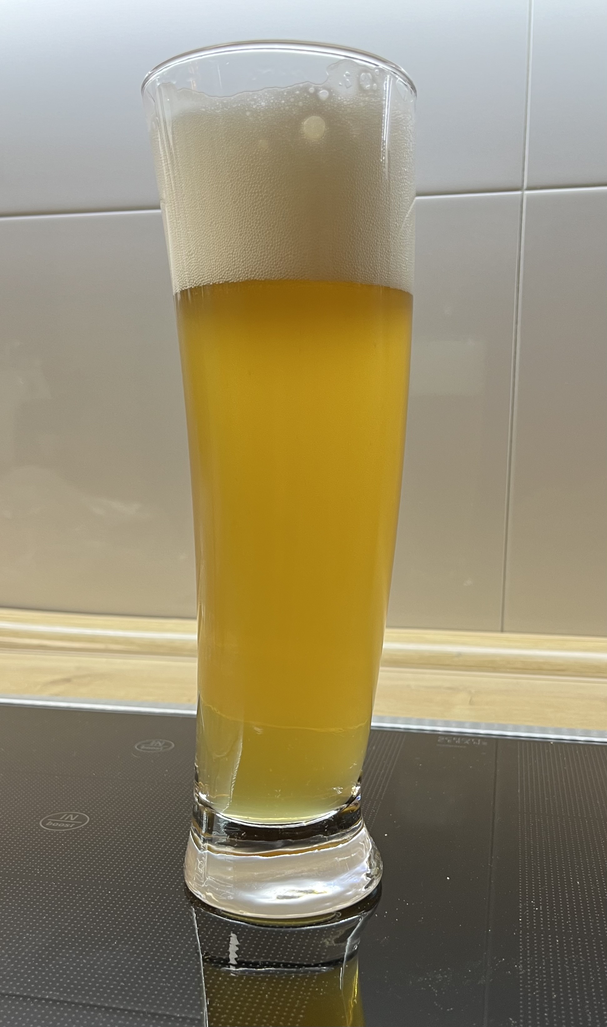 Stohgelb mit tollen Reflexen im Glas. Leicht trüb. Feinporiger standhafter Schaum in astreinem Weiß