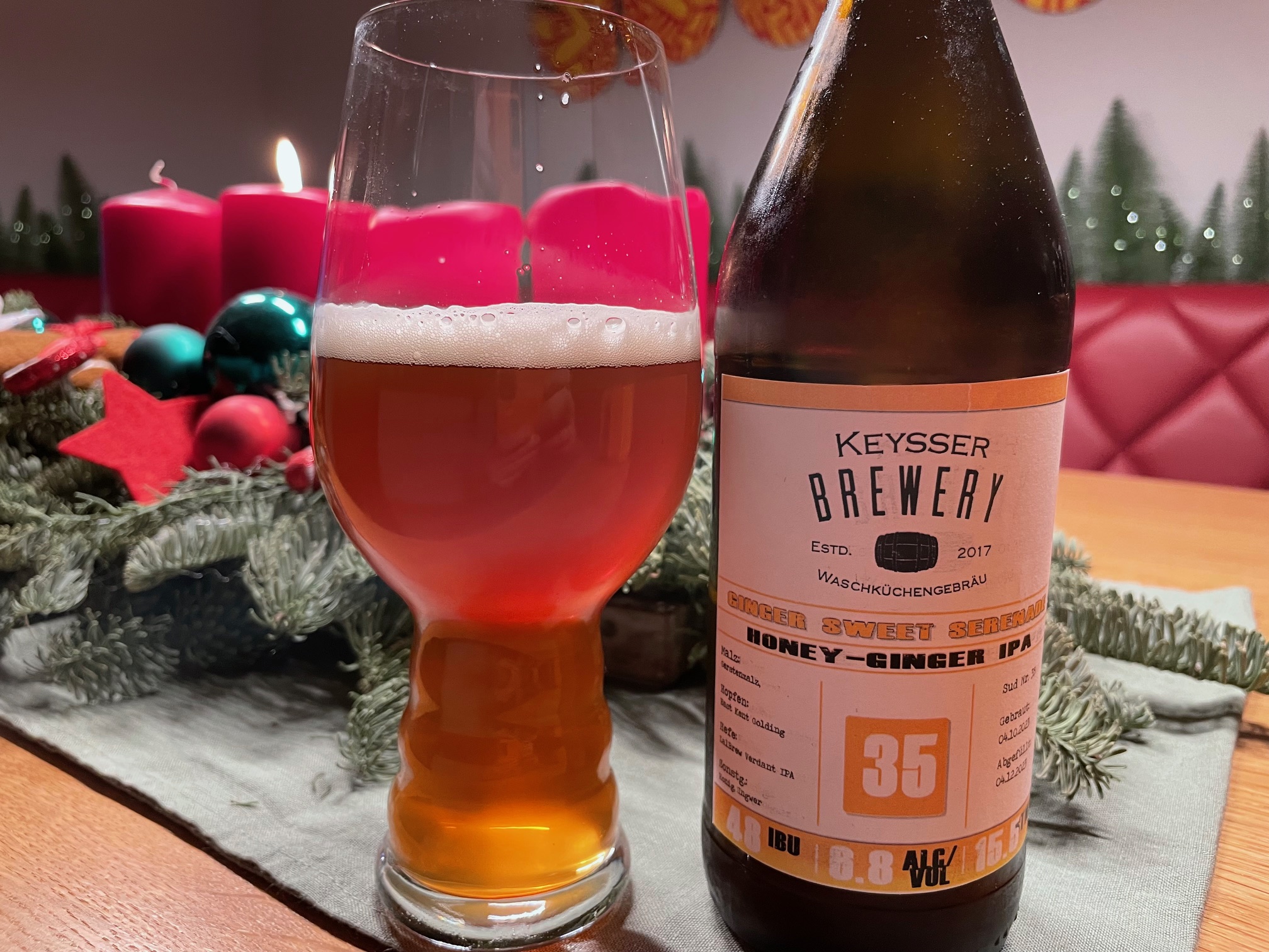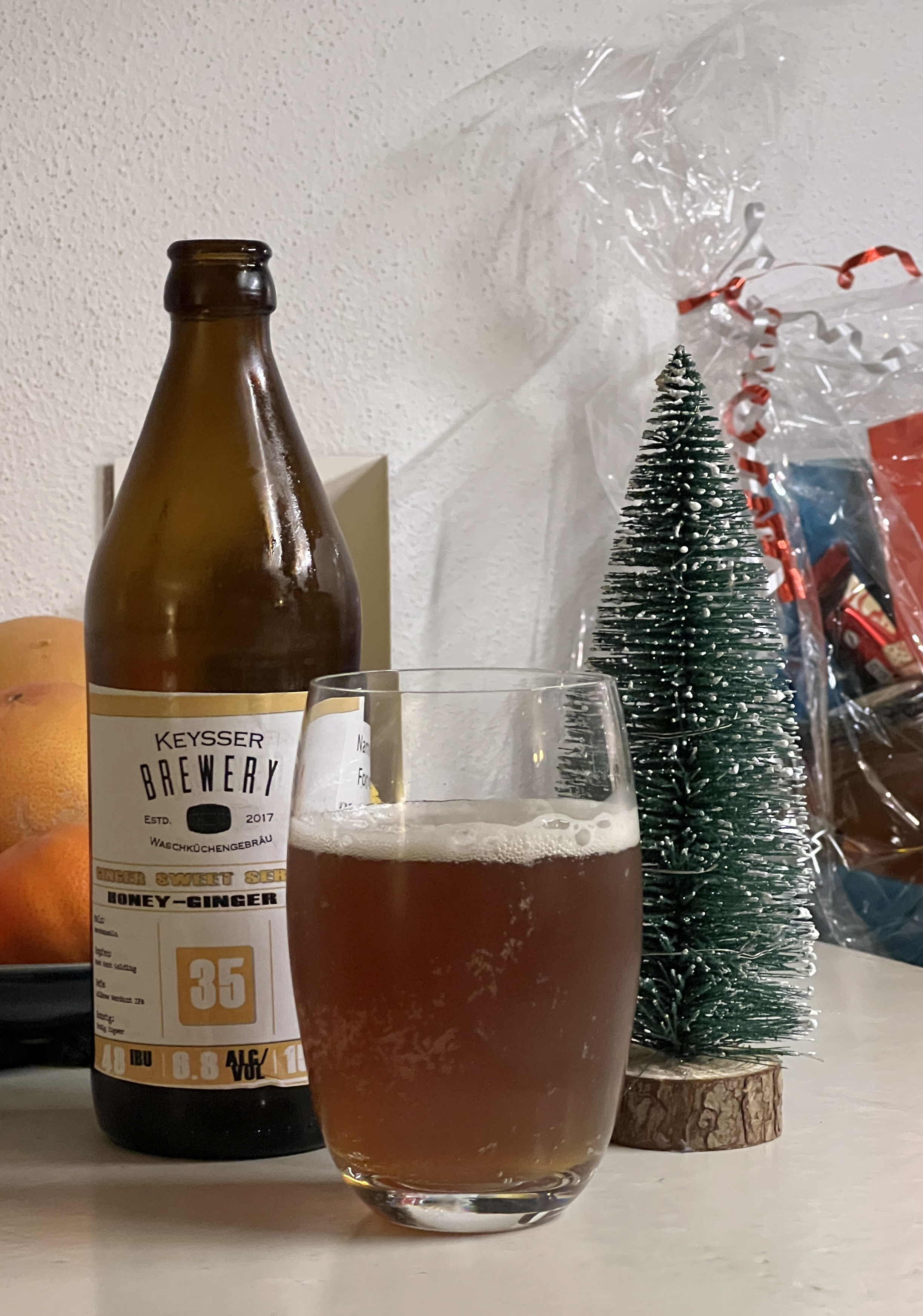 Ich komplettiere dann mal meine Eindrücke mit dem Gingerbread Ale von Dieter. Ein schönes, kupferfarbenes Ale mit einem wunderbaren Schaum. Sehr mild, wenig Bittere. Das Bier workt relativ schlank und ist nicht so süß wie ich das bei Lebkuchen erwarten würde. Leichte Gewürze in der Nase und im Antrunk. Nicht zu gewürzig, ich kann das auch nicht genauer differenzieren. Das Bier ist mit knapp 10 Grad nicht zu kalt, aber die zweite Flasche probiere ich etwas wärmer. Vielleicht sind die Gewürze dann noch kräftiger. Auf jeden Fall ein schönes, nicht zu anstrengendes Bier mit leichtem winterlichen Touch. Gefällt mir und passt zum Wetter vor der Tür. Vielen Dank dafür!
