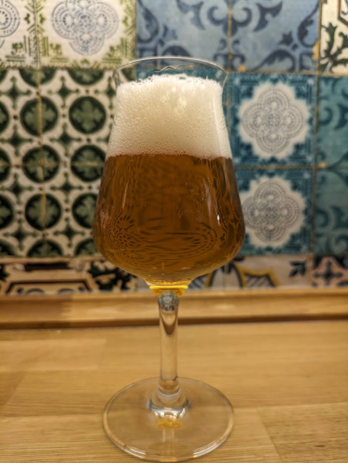 Bernsteinfarben mit schönem Schaum. Im Geruch frisch mit deutlich Holler. Im Mund dann fruchtig mit leichter Säure, insgesamt sehr clean und crisp.