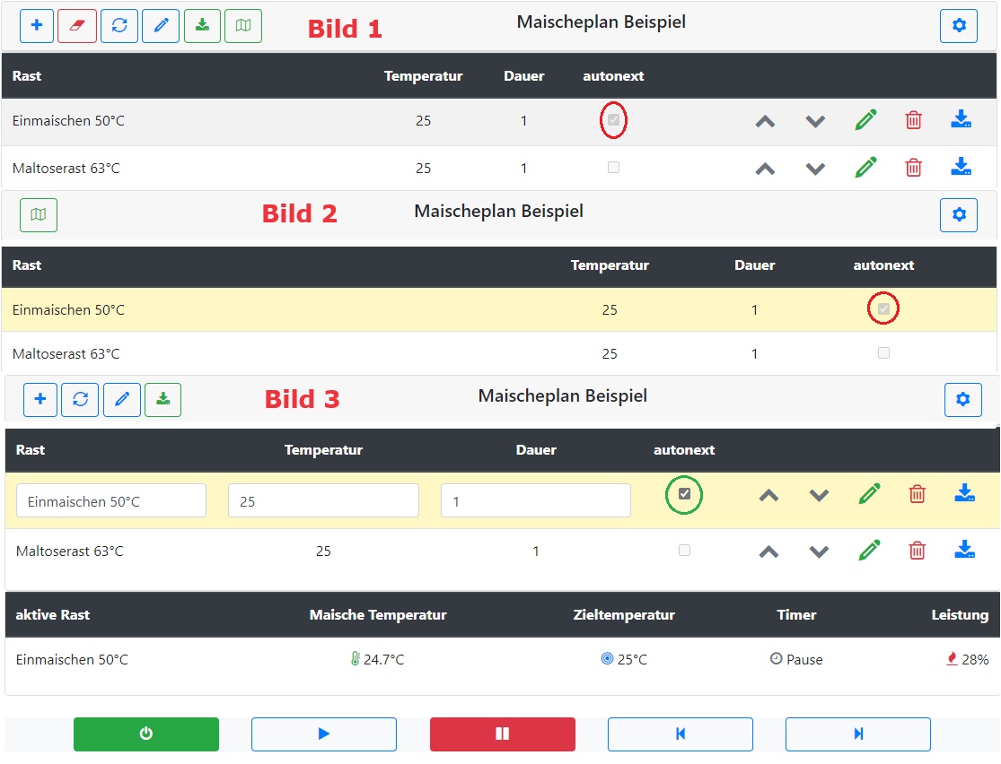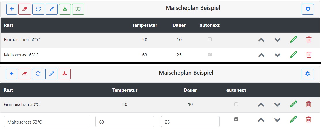 jbrand hat eine Kamera bei mir verstecktjbrand hat geschrieben: Freitag 2. Februar 2024, 07:32 Alternativ könntest du auch einen globalen Edit-Button schaffen und stattdessen die Buttons aus den einzelnen Zeilen entfernen. Dann müsste man vor jeder Bearbeitung den Button klicken, damit werden dann alle Zeilen editierbar. Gleichzeitig könntest du dann alle anderen Steuerelemente deaktivieren, so dass man im Editiermodus nicht versehentlich das Maischeprogramm starten kann.