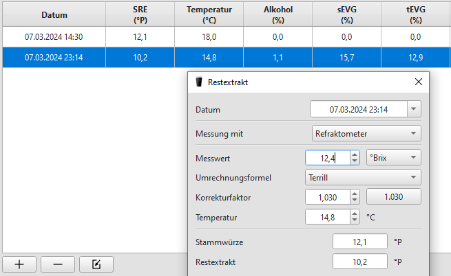 Im Fenster "Gärverlauf" wird dabei automatisch die erste Zeile angelegt mit SRE 12,1°P.