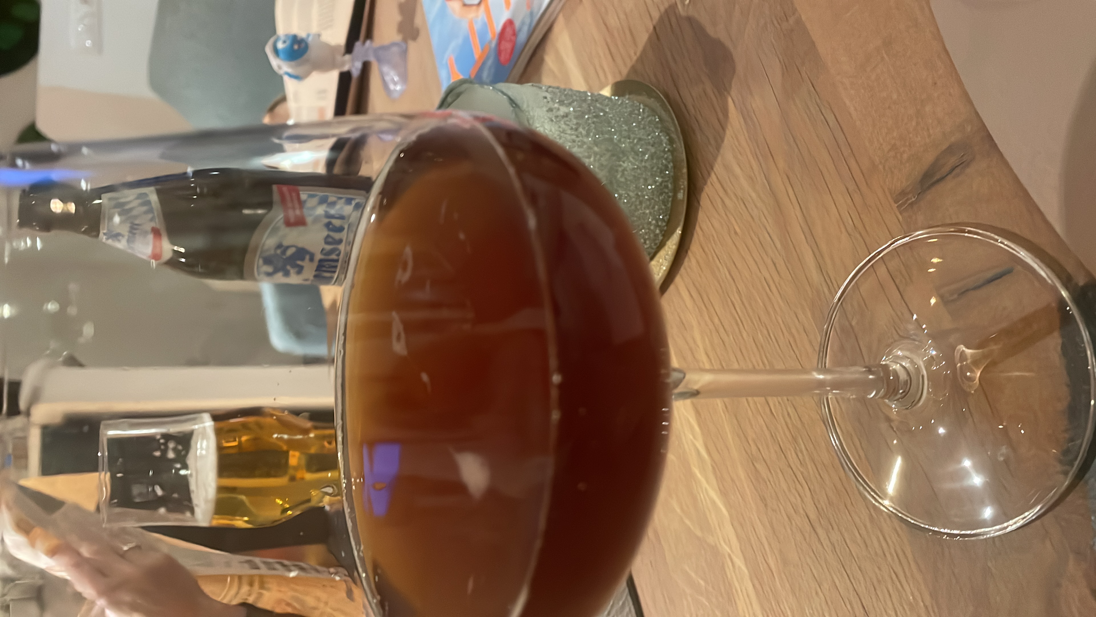 Mein belgisches Dubbel. Wunderbar gereift. Trockenfrüchte mit leichtem Sherry. Hinten raus schmeckt man zum Glück den Alkohol. Denn spüren tut man die gut 8% sehr deutlich.