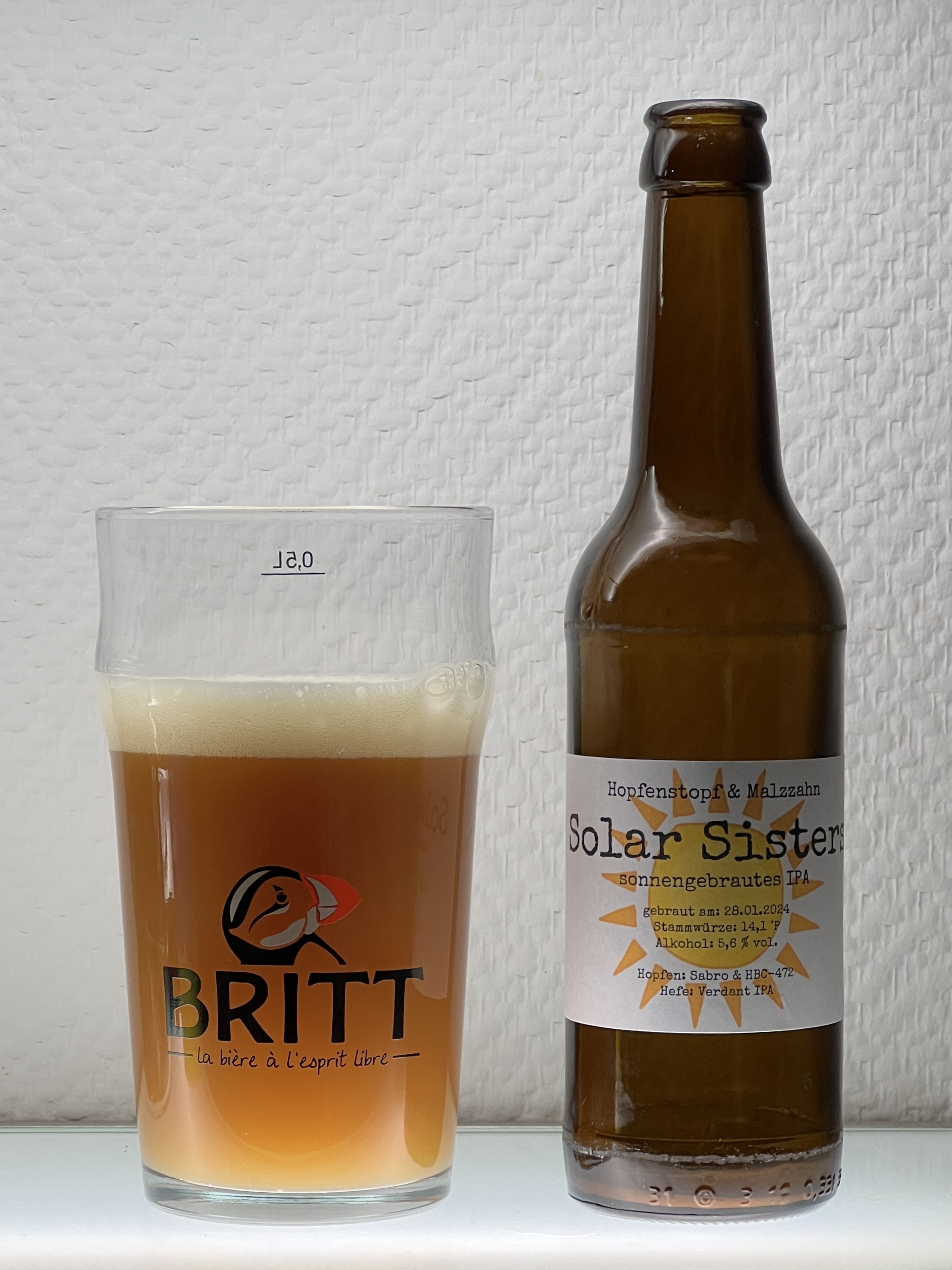 Eine Testflasche unseres ersten mit 100 % Solarstrom gebrauten IPA. Etwas dunkler mit reichlich Sabro und HBC-472 im Whirlpool. Tolle Hopfenkombination, ausgewogene Bittere, ich bin zufrieden. Nur die Verdant IPA sedimentiert nicht gut. Ein paar Flaschen habe ich noch, der Rest kann ein paar Wochen im Keg lagern und klärt sich hoffentlich.