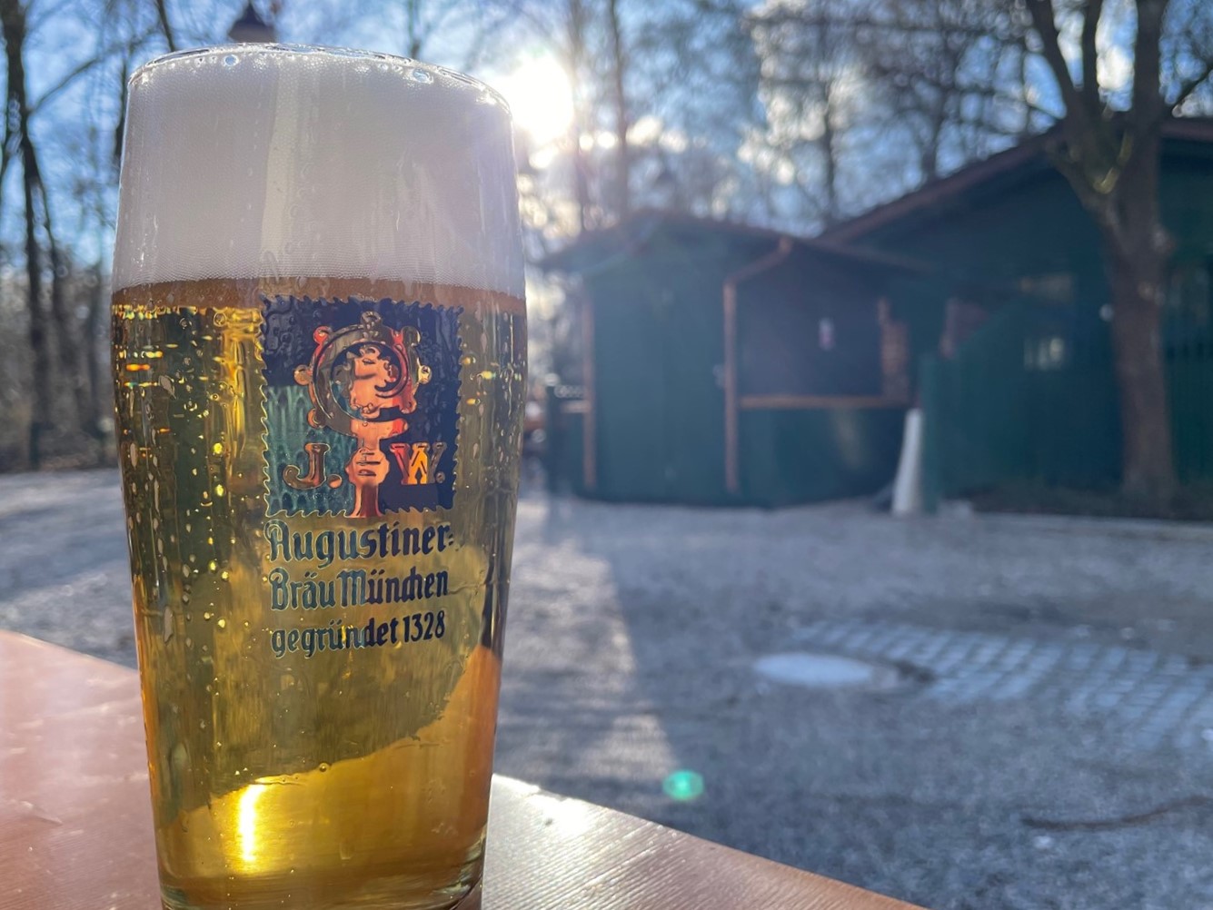 Ein Augustiner Hell frisch vom Holzfass gezapft im gekühlten Glas. Ein Genuss! Augustiner Bavariapark hat innen z.T. umgebaut, der Tresen ist woanders, es ist viel schönes Holz verbaut. Im Außenbereich ist endlich die Baustelle verschwunden. Heute zur Einkehr ein Traum bei bestem Wetter.