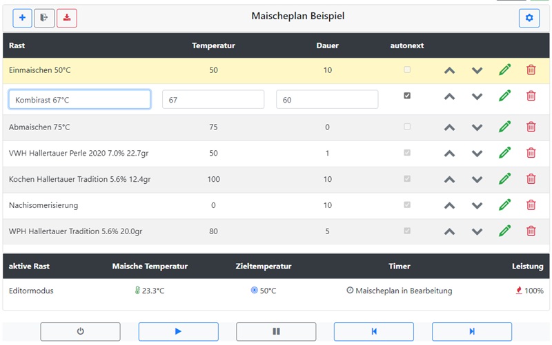ist umgesetzt. Mit 1.35b kann von Stiftsymbol zu Stiftsymbol gewandert werden. Der Zeileneditor übernimmt die Werte, schließt die "alten" Zeile und öffnet die "neuen". Das gleiche Verhalten haben auch die Buttons Zeile nach oben, Zeile nach unten verschieben, Zeile löschen und neuen Maischeschritt hinzufügen. Es kann weiterhin mehrmals auf das Plussymbol geklickt werden. Es werden entsprechend viele neue Tabellenzeilen an das Tabellenende angefügt.