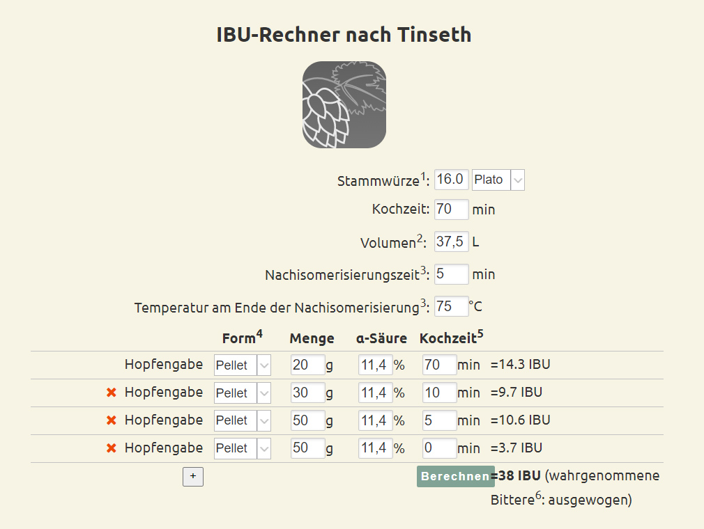 Die ursprüngliche Schüttung sieht so aus (37,5 Liter bei 16 °P, SHA ca. 62 %)