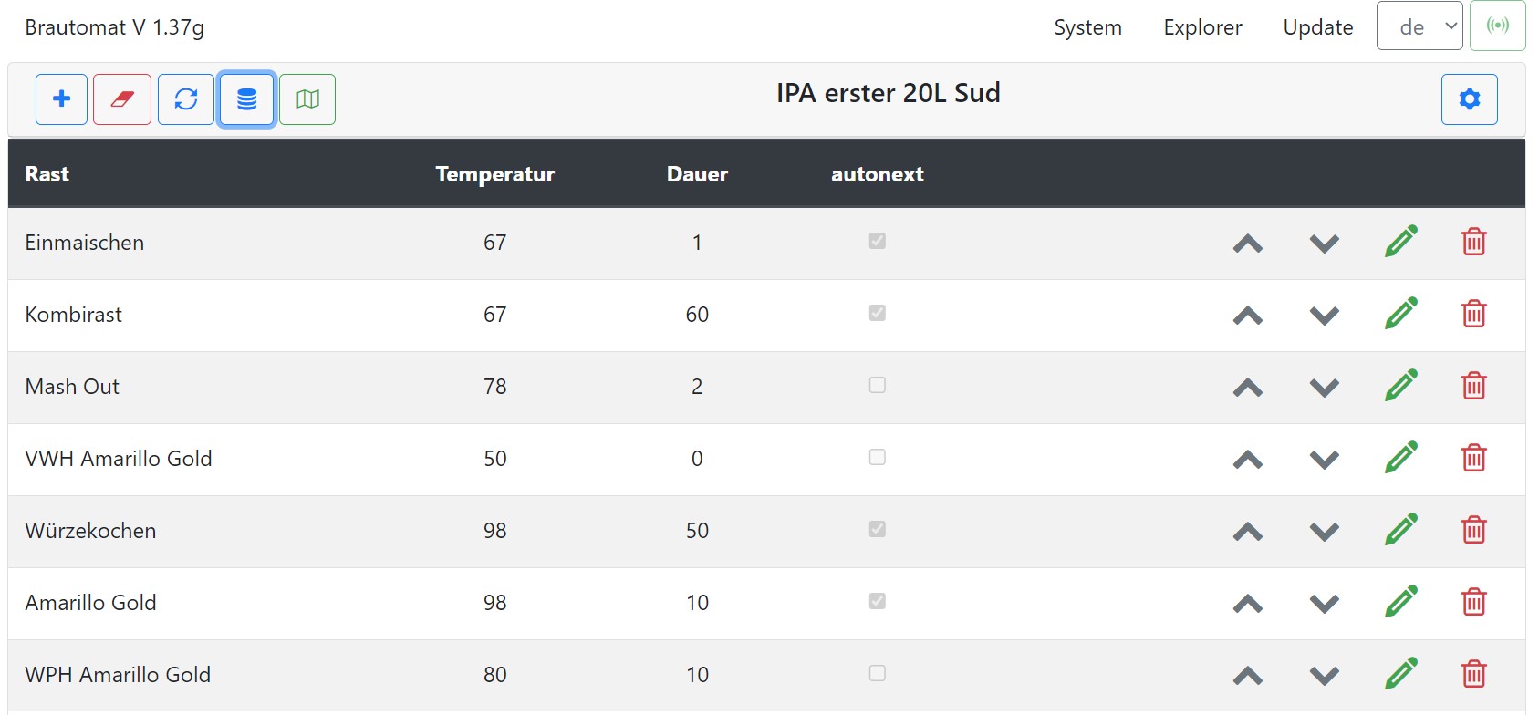 ist umgesetzt. Mit 1.35b kann von Stiftsymbol zu Stiftsymbol gewandert werden. Der Zeileneditor übernimmt die Werte, schließt die "alten" Zeile und öffnet die "neuen". Das gleiche Verhalten haben auch die Buttons Zeile nach oben, Zeile nach unten verschieben, Zeile löschen und neuen Maischeschritt hinzufügen. Es kann weiterhin mehrmals auf das Plussymbol geklickt werden. Es werden entsprechend viele neue Tabellenzeilen an das Tabellenende angefügt.