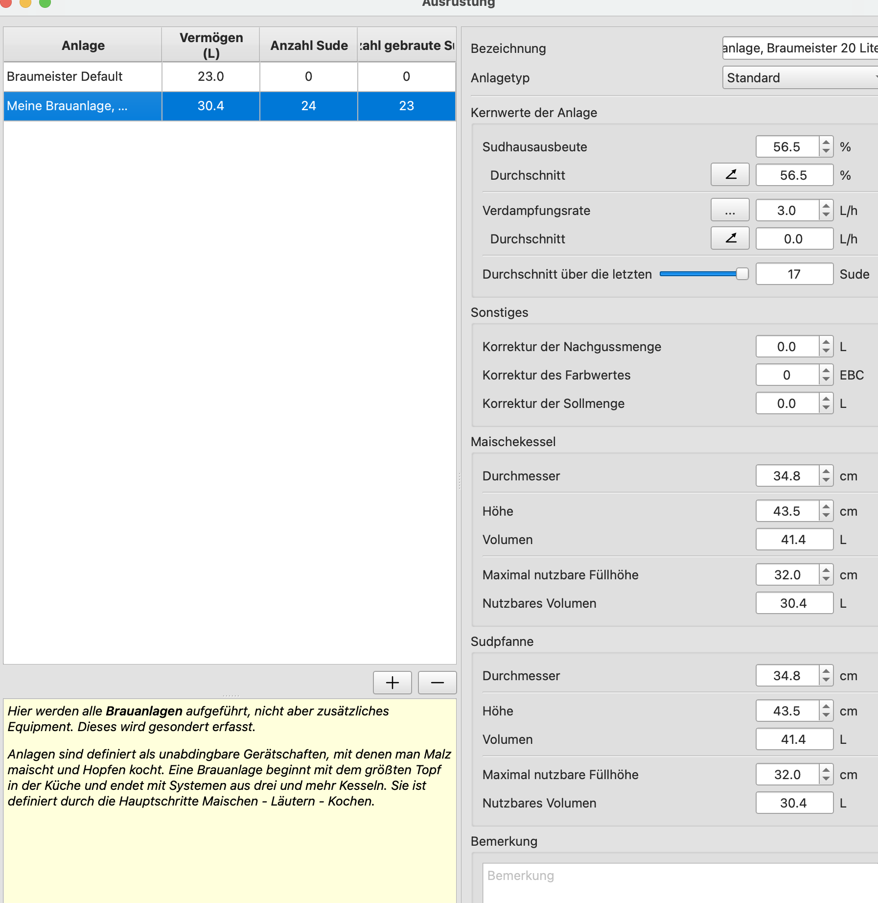 Vorsicht mit dem Auswahlbutton für den Anlagentyp z.B. BM20L, da überschreibst du dir deine Werte für Maischekessel/Sudpfanne.